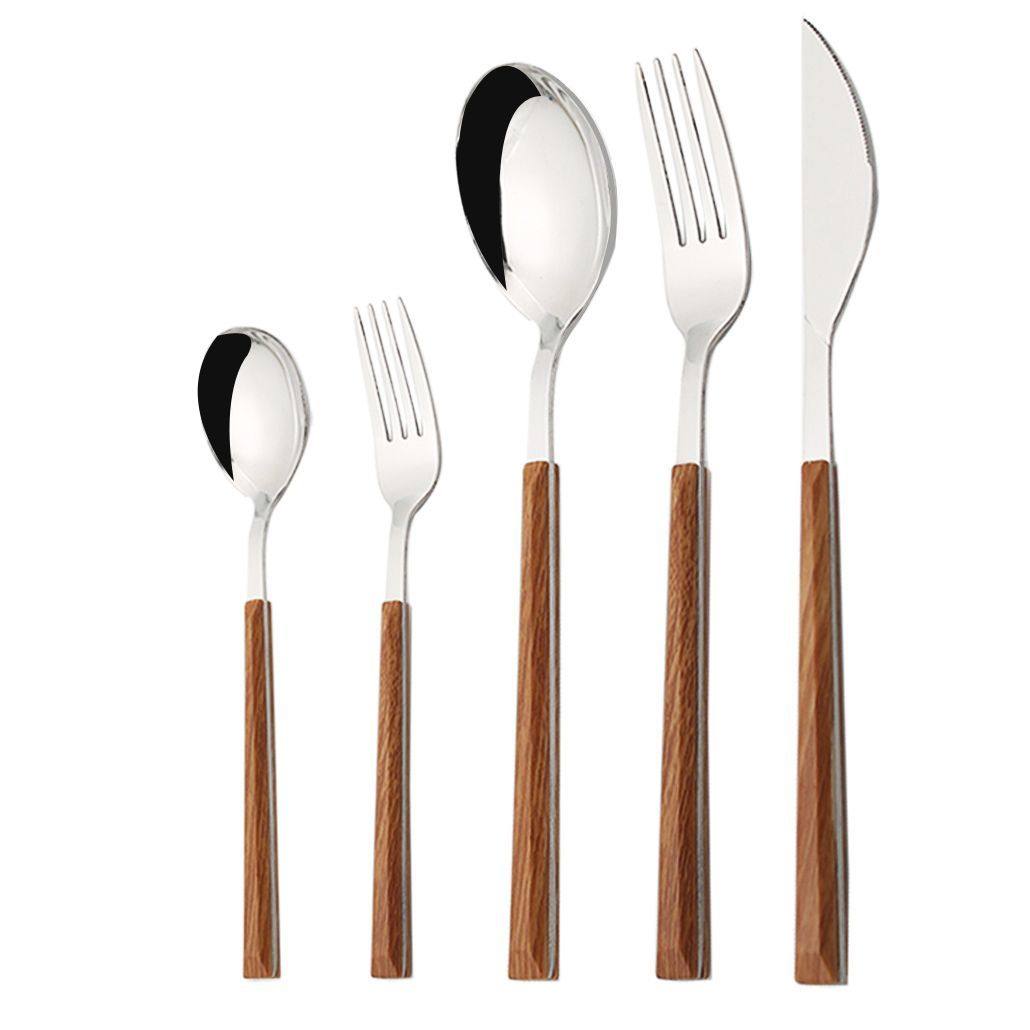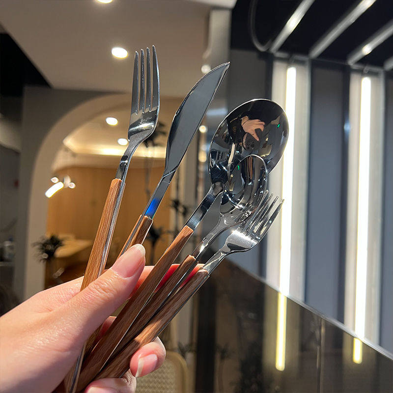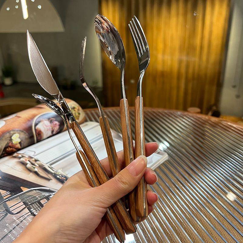 ins款仿木纹细长柄刀叉勺西餐早餐甜品勺韩风餐厅不锈钢水果叉子