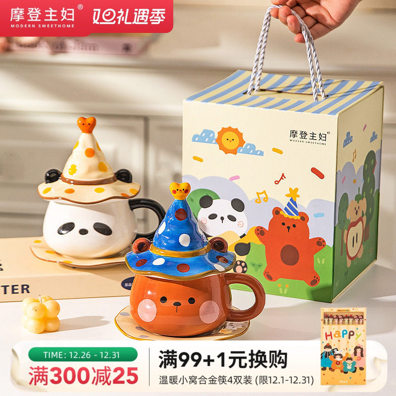 趣皿可爱马克杯卡通带盖带勺陶瓷杯情侣水杯咖啡杯子送女生伴手礼