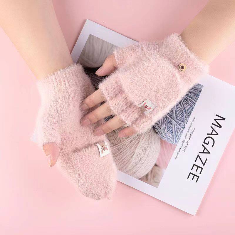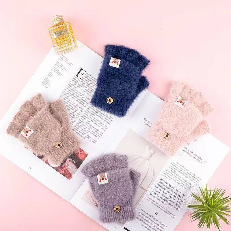 手套女冬天保暖加绒加厚学生潮写字骑行可爱针织半指翻盖手套