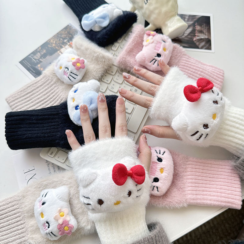 mikko联名可爱卡通猫咪毛绒手套女冬季翻盖半指触屏加厚骑行保暖