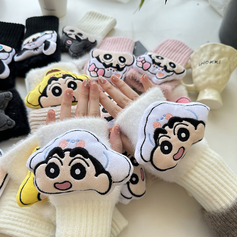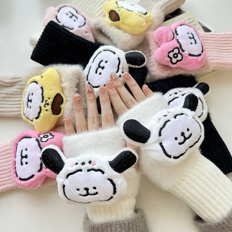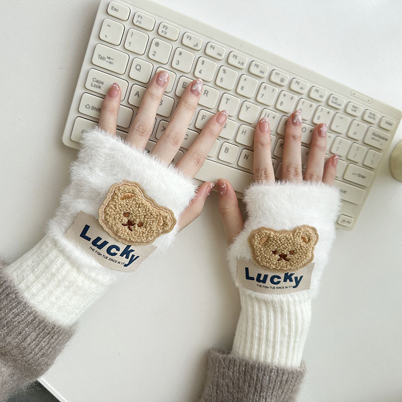 新款毛绒半指手套卡通针织护腕加厚保暖少女办公学生写字手套