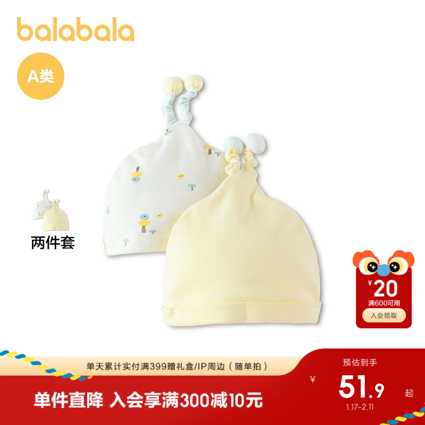 【商场同款】巴拉巴拉婴儿帽子新生儿胎帽2026新款亲肤宝宝两件装