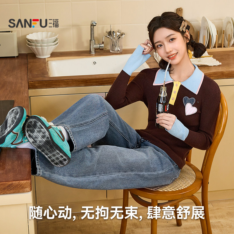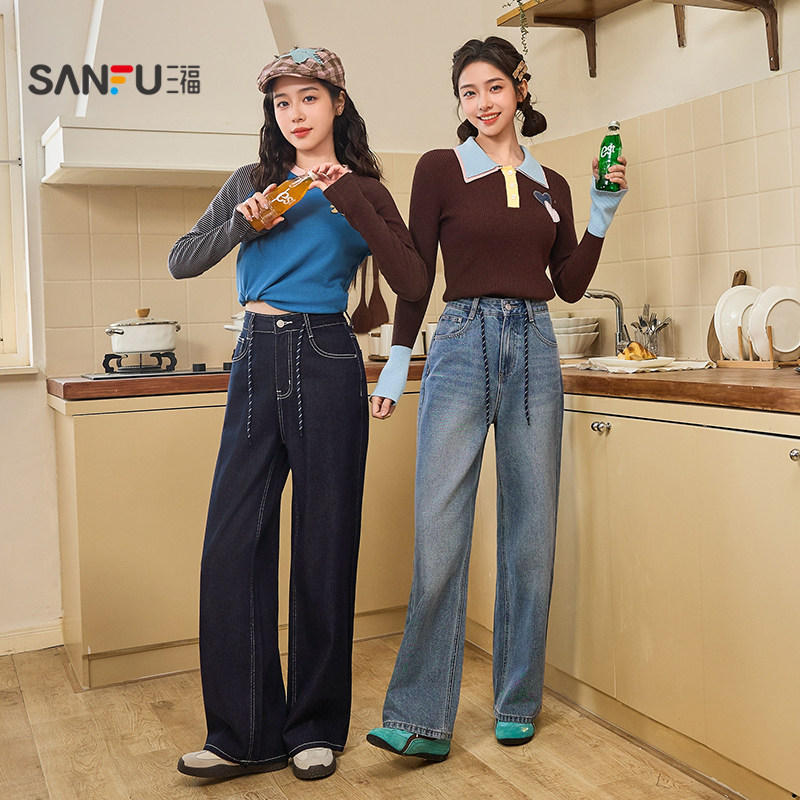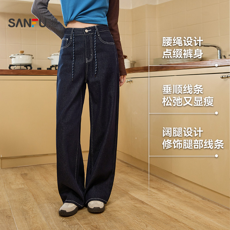 三福牛仔长裤2025新款冬季磨毛阔腿裤复古深色宽松裤子女装512304