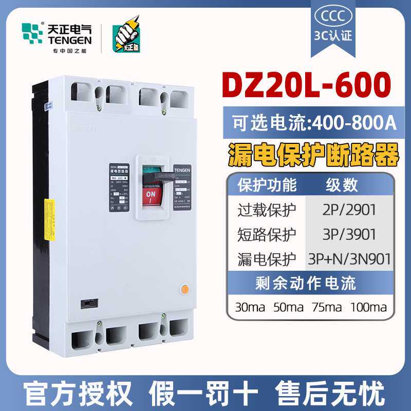 天正漏电塑壳断路器DZ20L-600/3N300三相四线600A500漏保空气开关