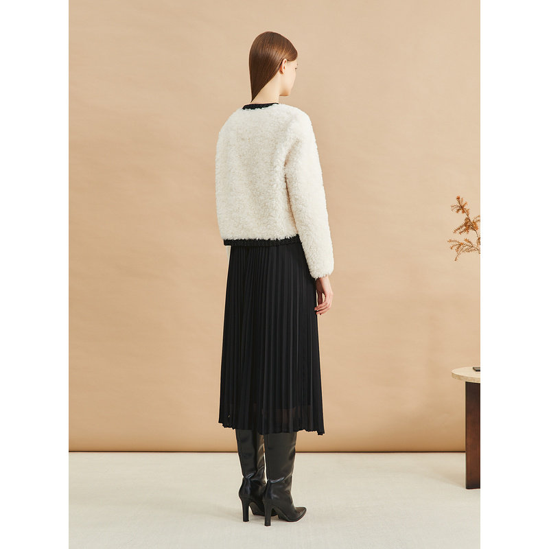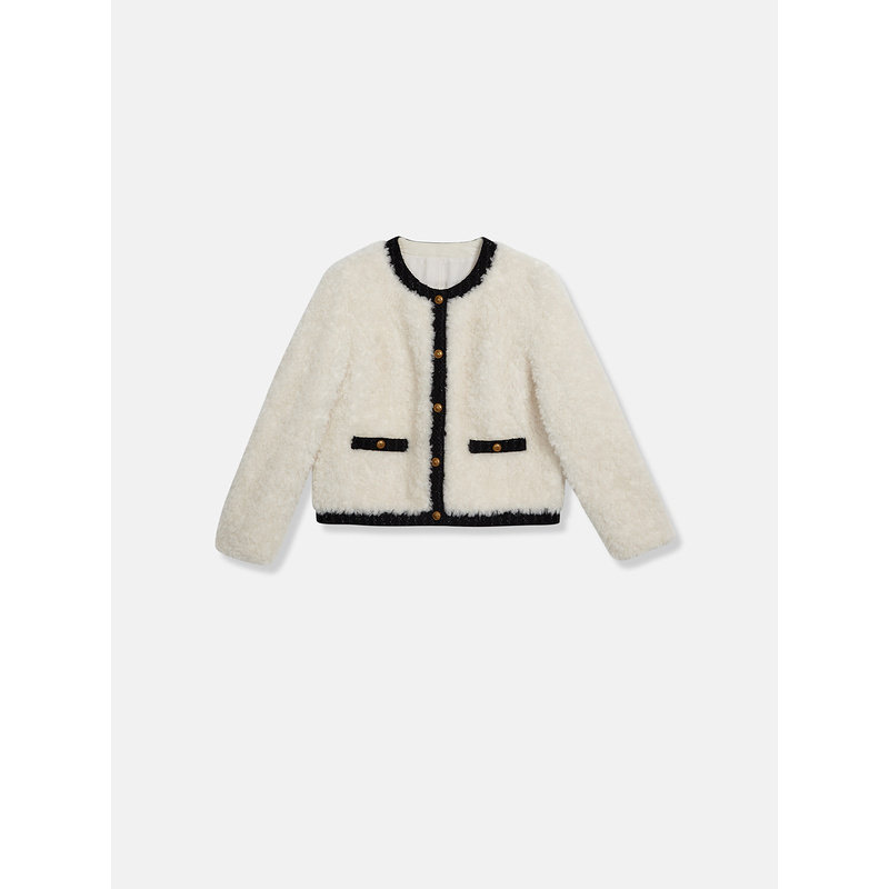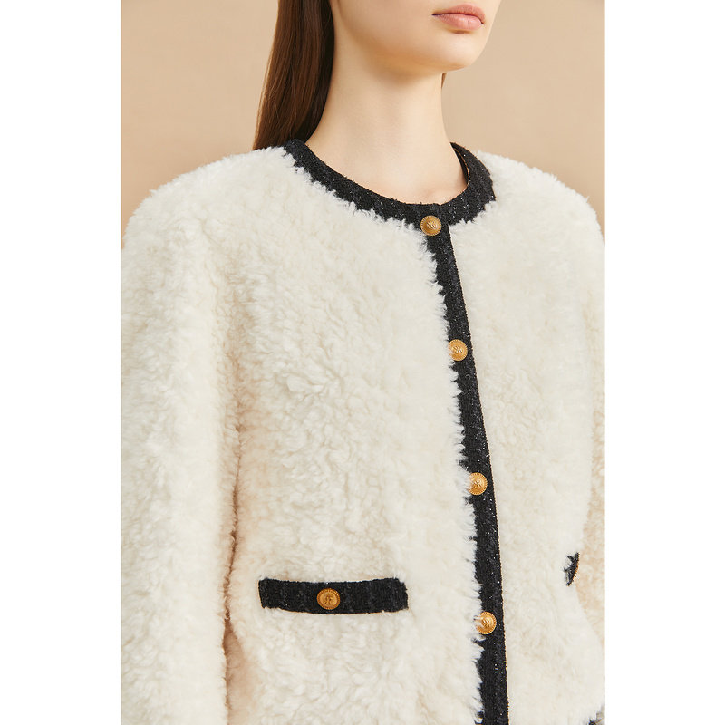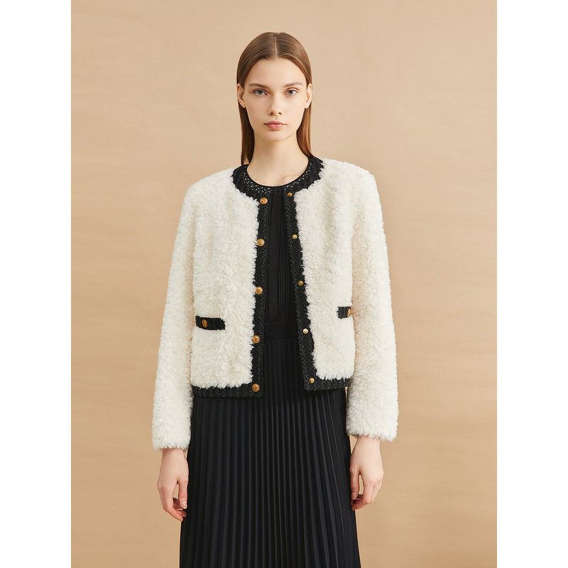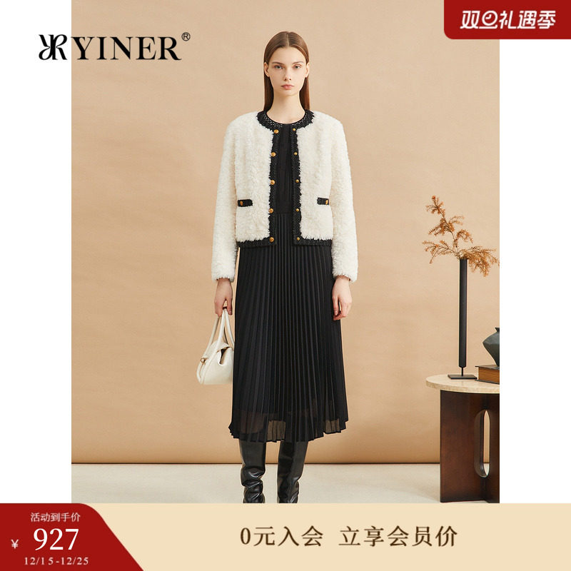 YINER音儿专选女装冬季时尚法式短款撞色拼接环保羊毛皮草外套