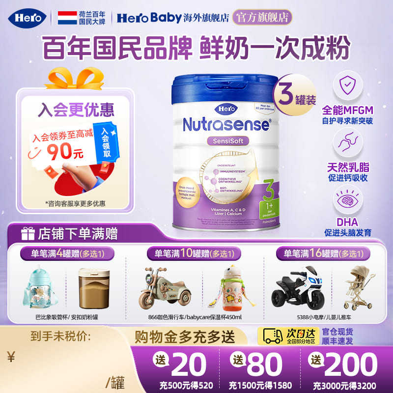 HeroBaby白金版升级DHA乳脂球膜婴幼儿配方牛奶粉3段700g*3罐