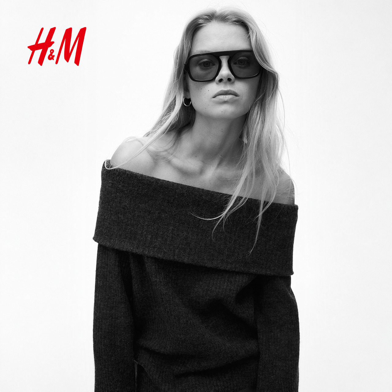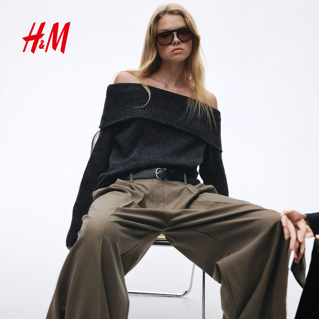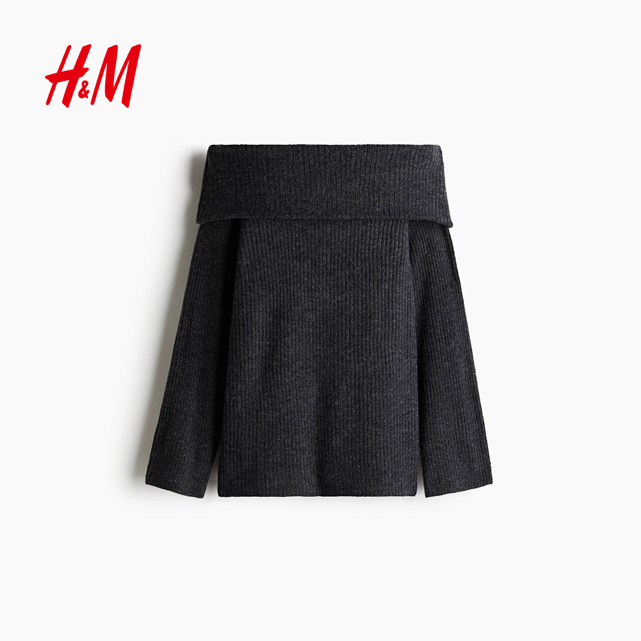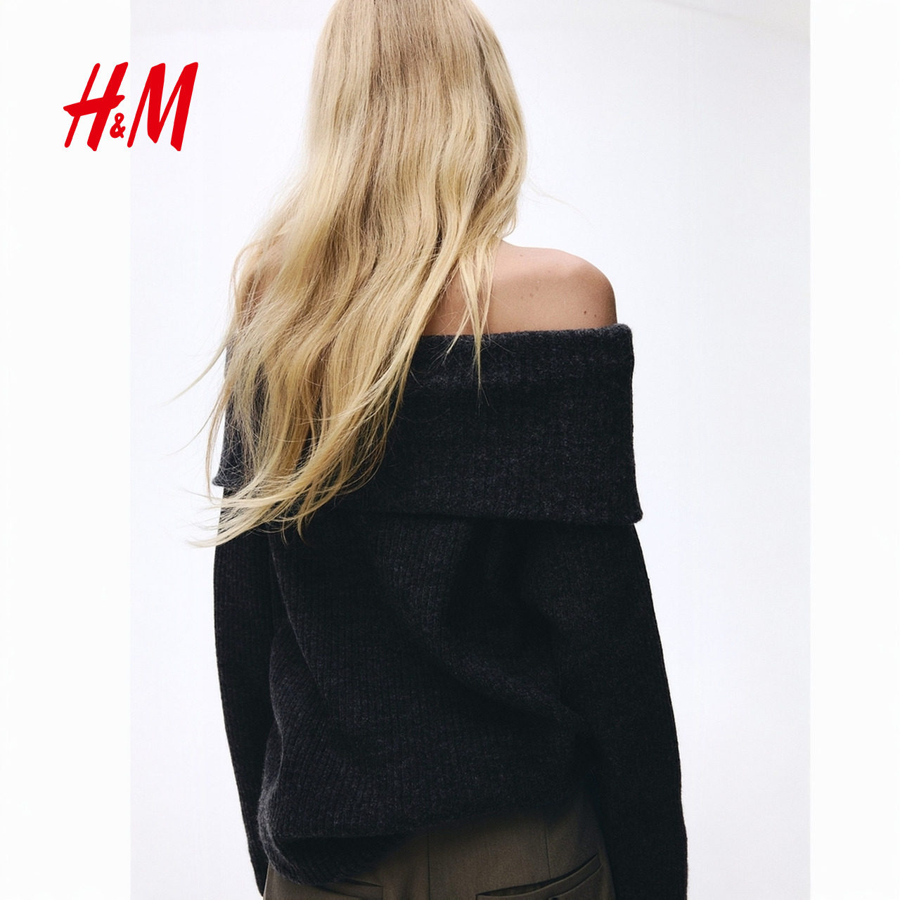HM女装毛针织衫2025新款露肩宽松内搭气质酒红色打底衫1294589