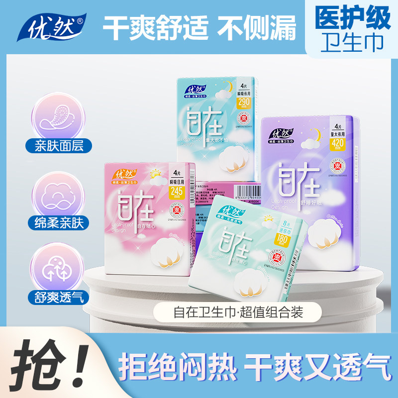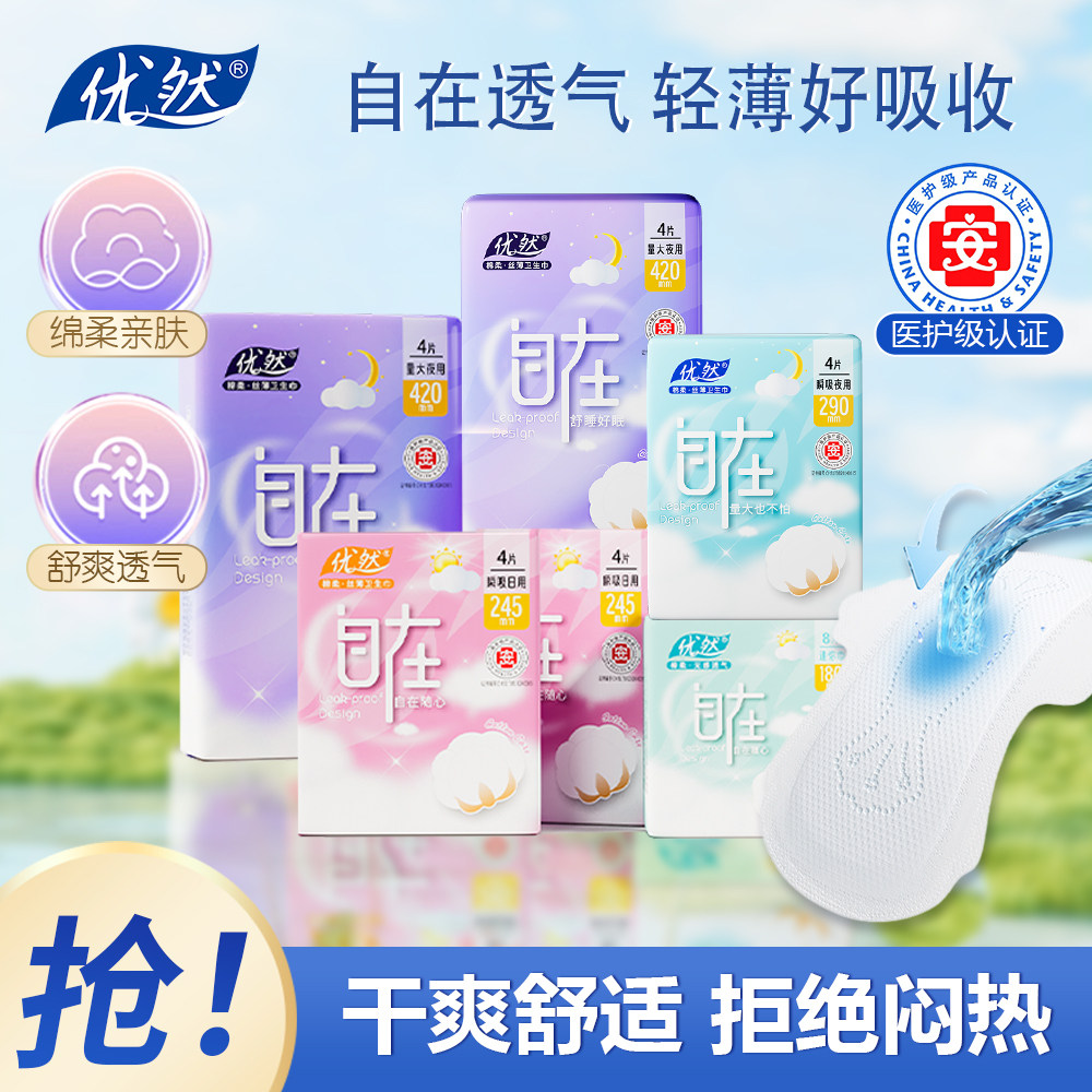 优然医护级290mm夜用卫生巾日用干爽透气姨妈巾批发自在标准亲肤