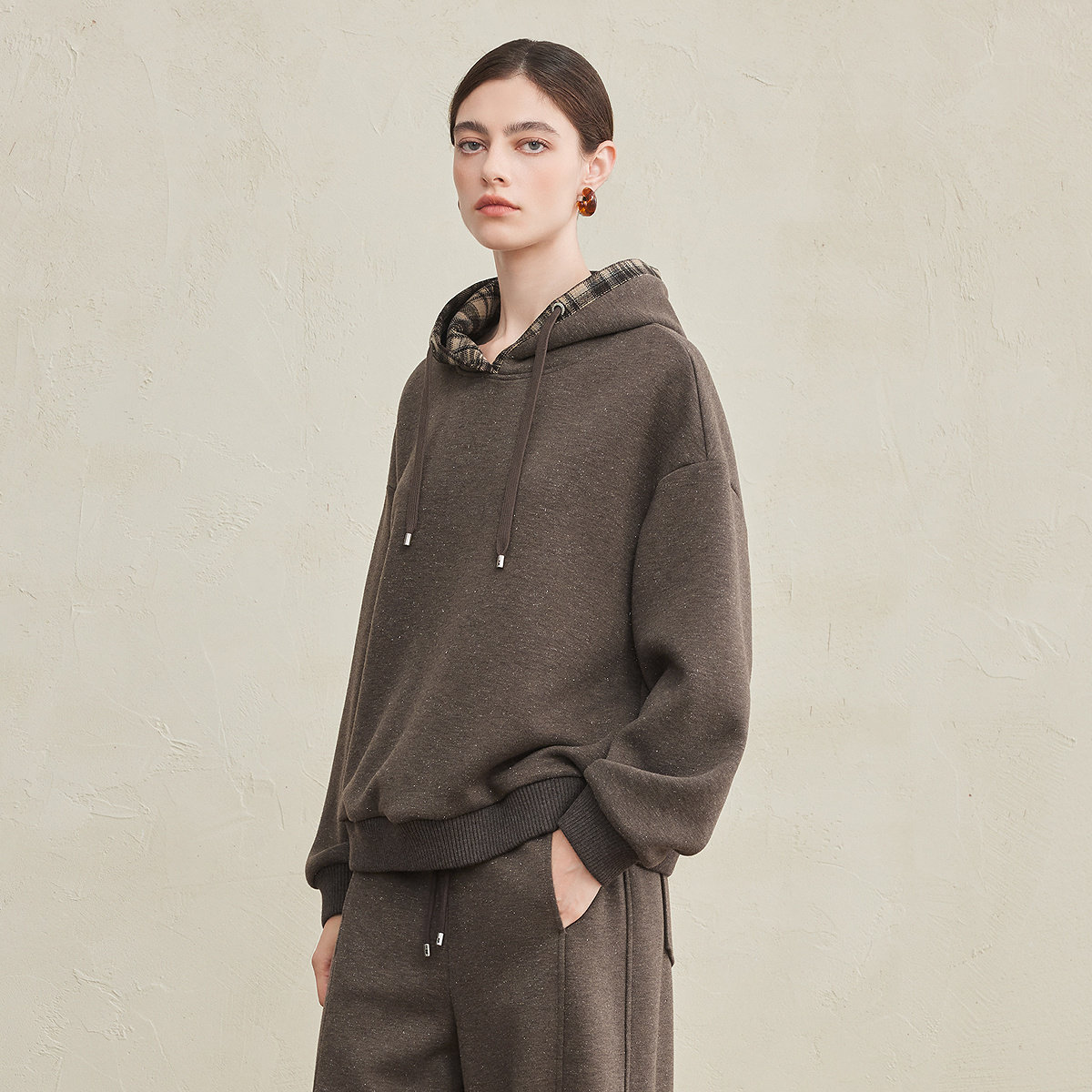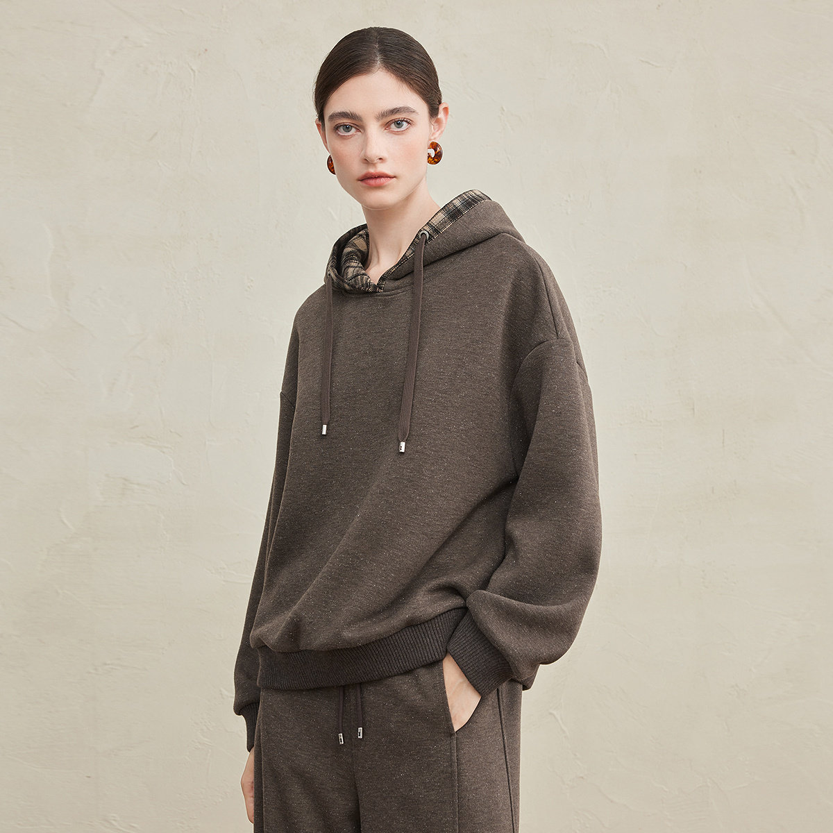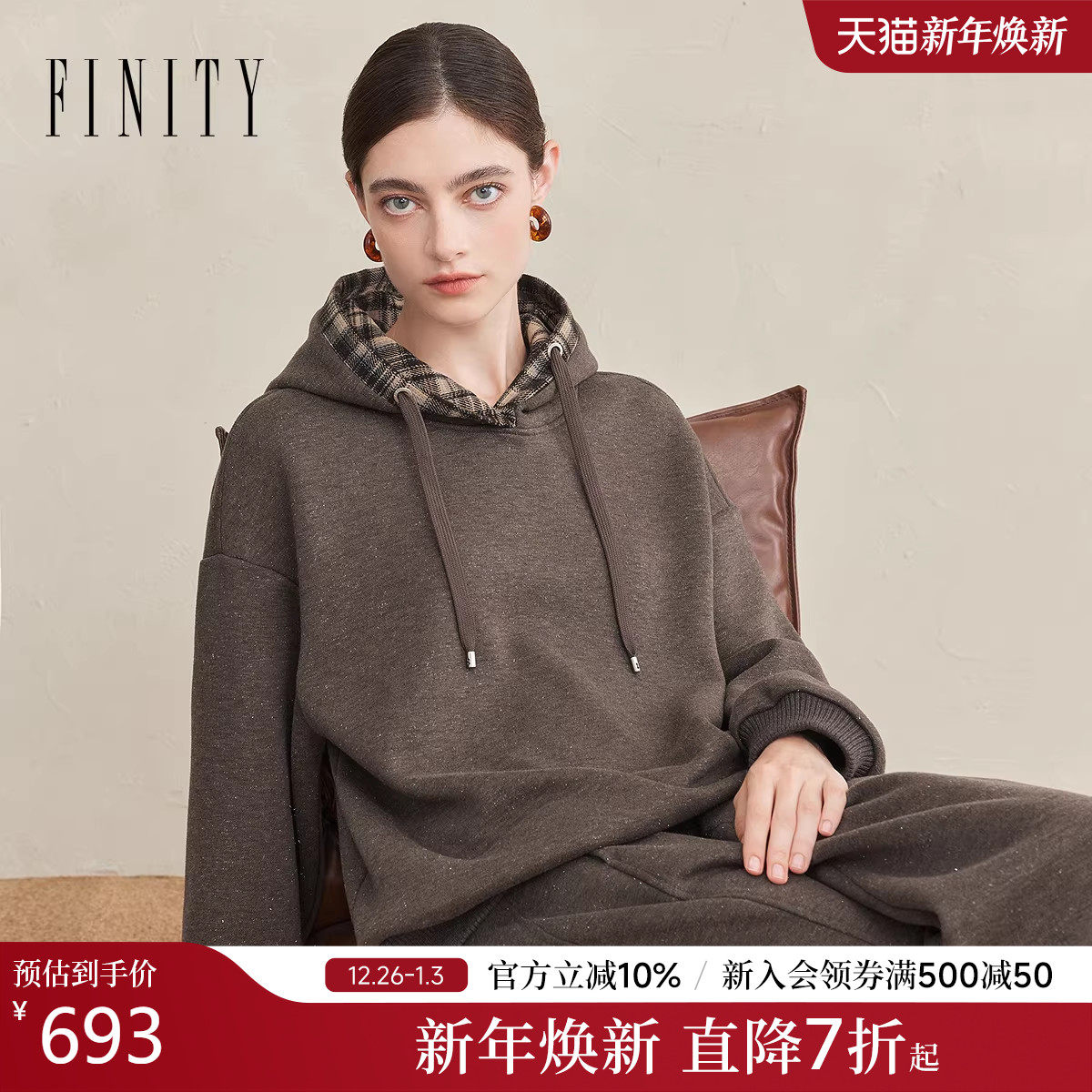 FINITY菲妮迪卫衣绒衫2025年冬季新款简约连帽咖啡色百搭上衣女士