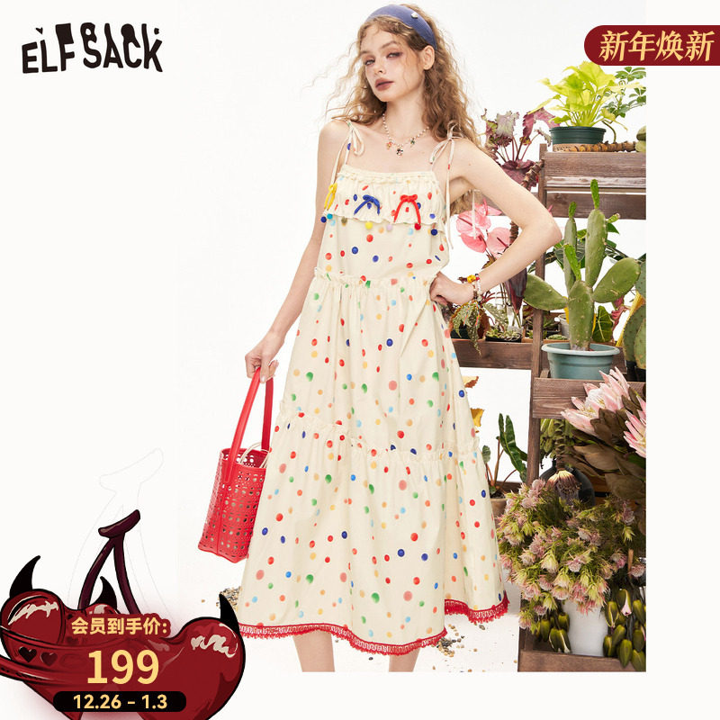 妖精的口袋彩色波点方领吊带连衣裙女2025年夏季新款收腰甜美裙子