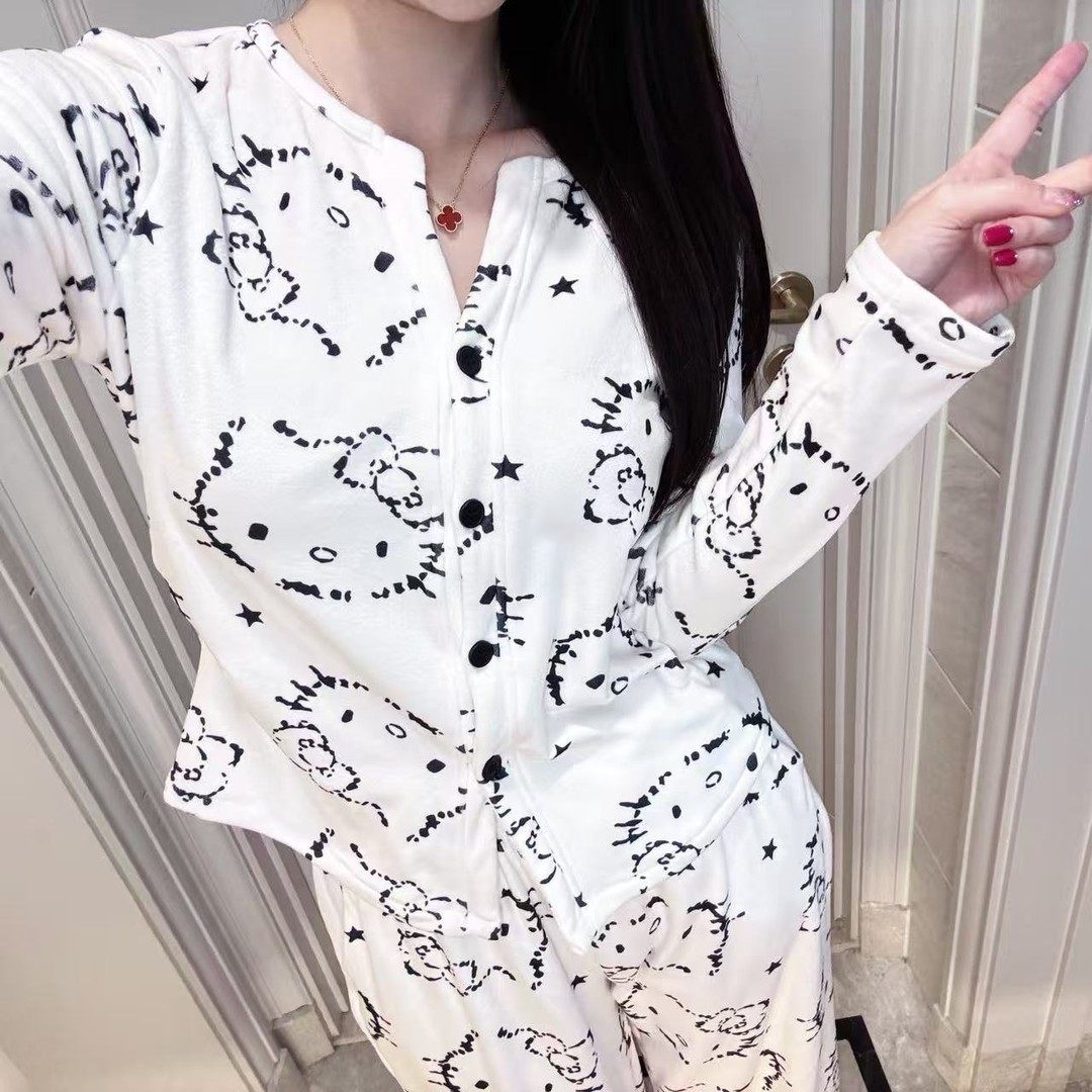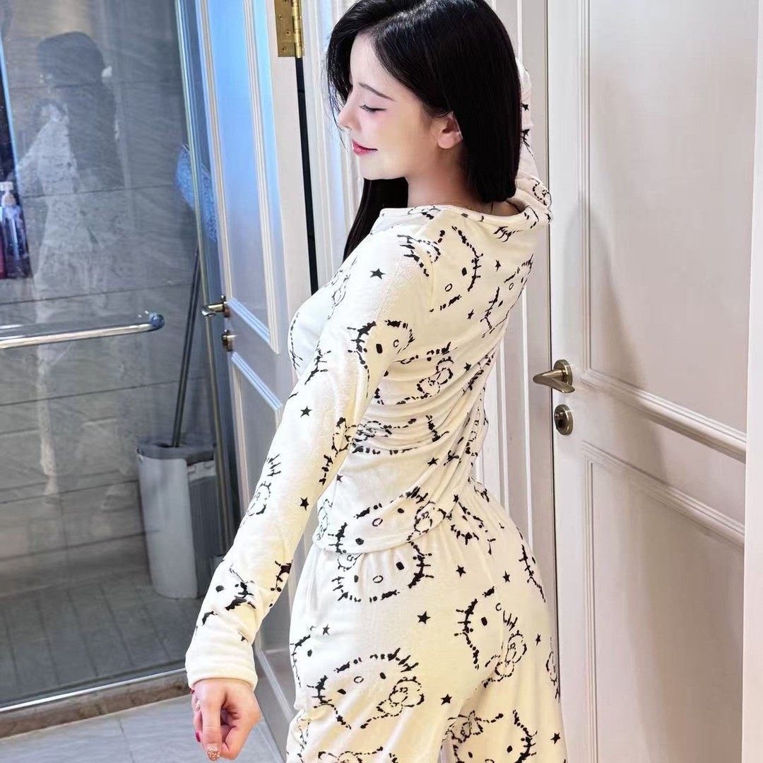 双面海岛绒睡衣女秋冬季V领奶系Kitty卡通超柔软长袖长裤家居服冬