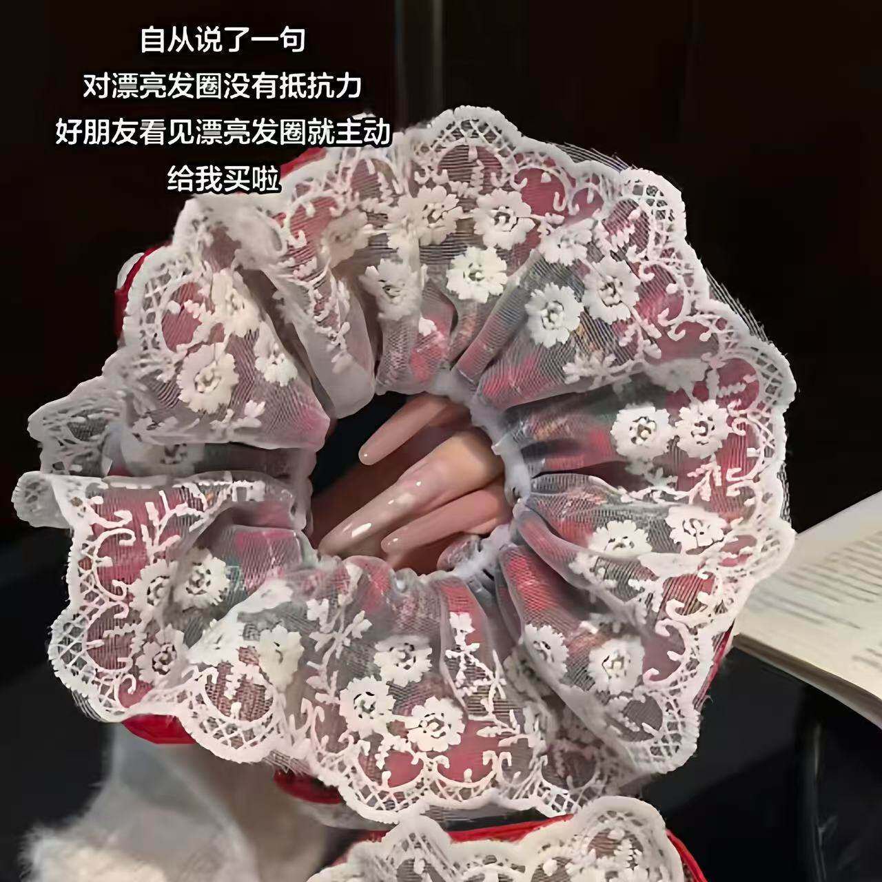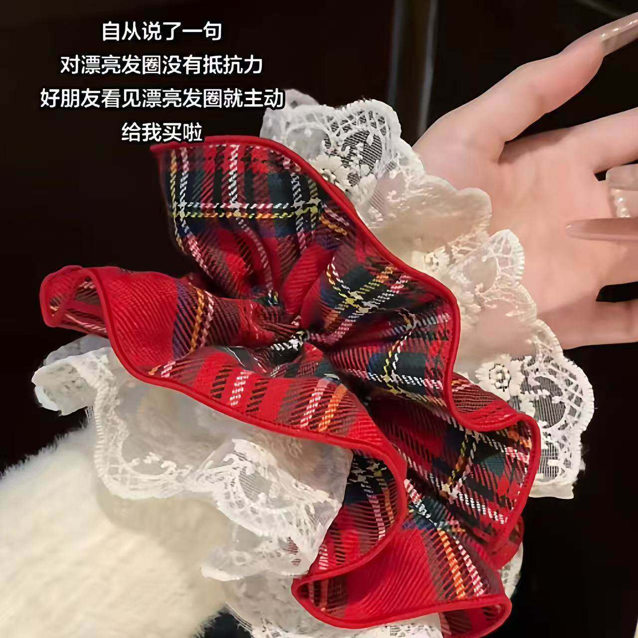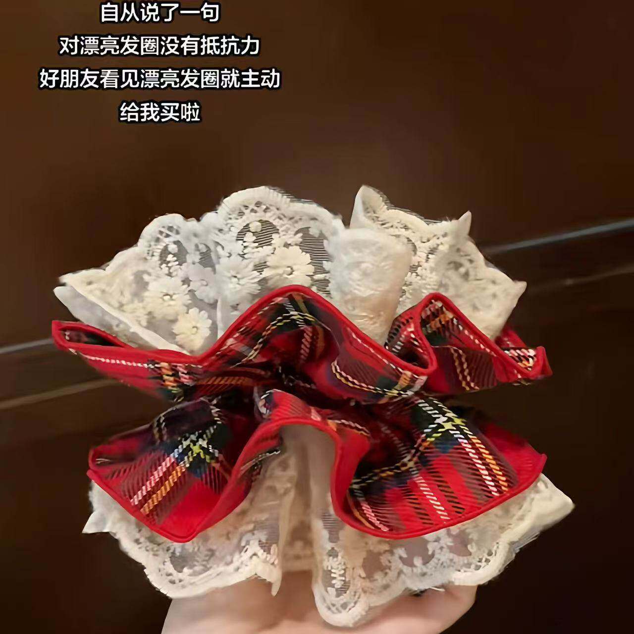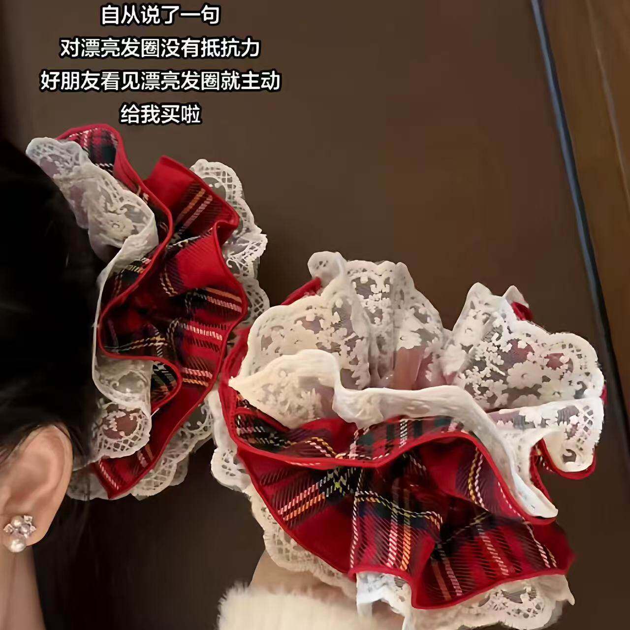 蕾丝花边气质新年红色格纹蕾丝发圈女甜美超仙大肠头绳气质头饰