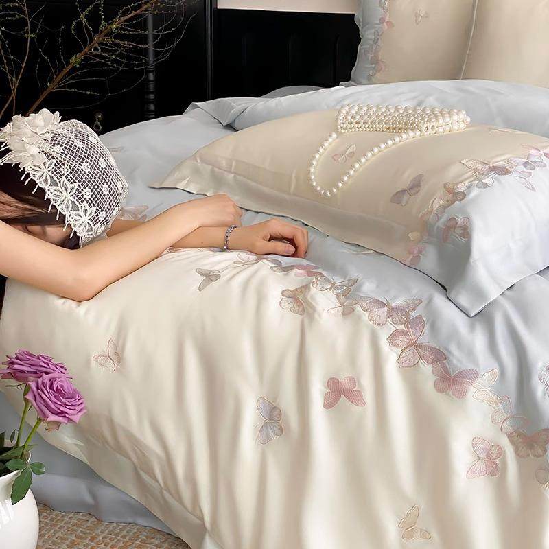小清新夏季凉感LF兰精天丝四件套浪漫少女心蝴蝶刺绣拼接被套床品