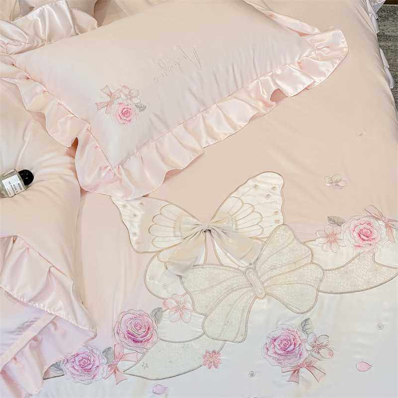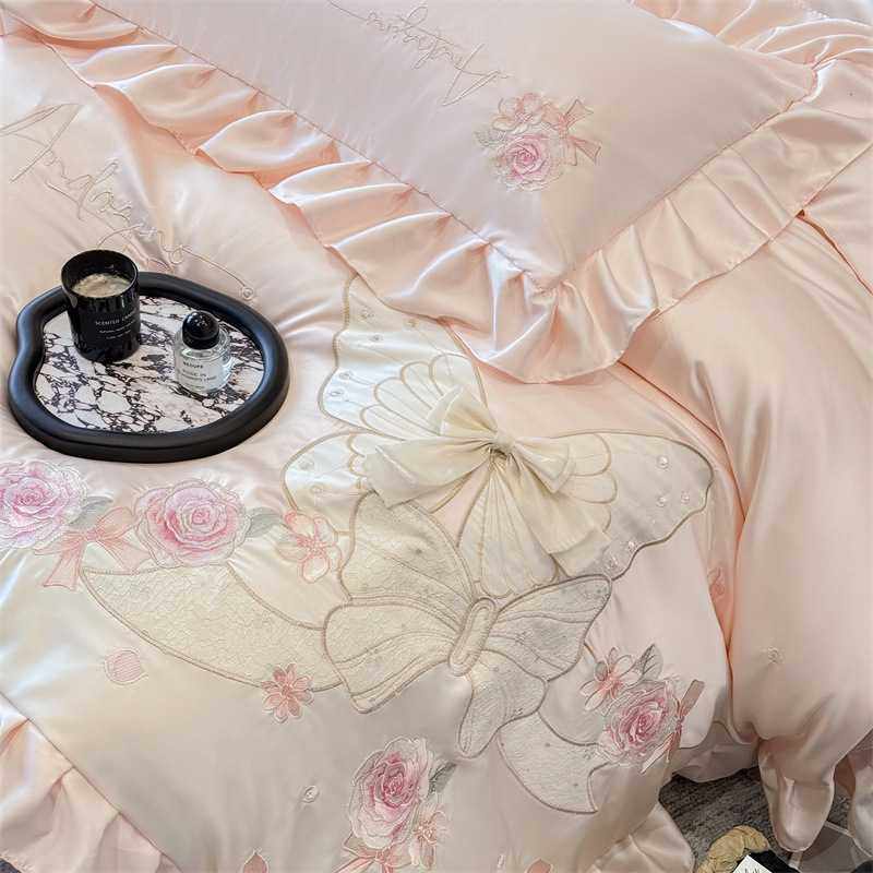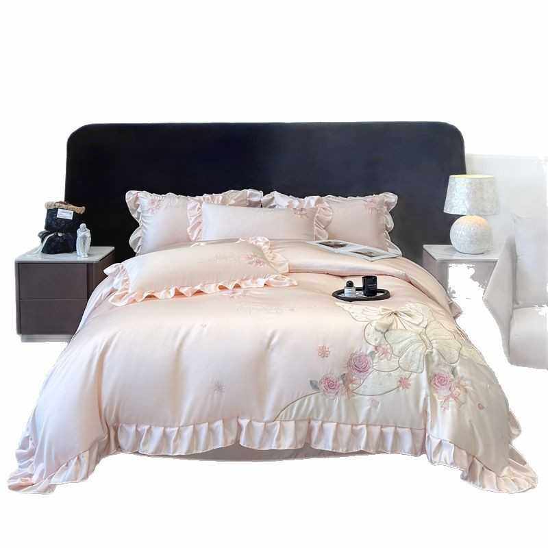 少女心凉感天丝四件套丝滑水洗真丝刺绣被套夏季公主风裸睡床品4