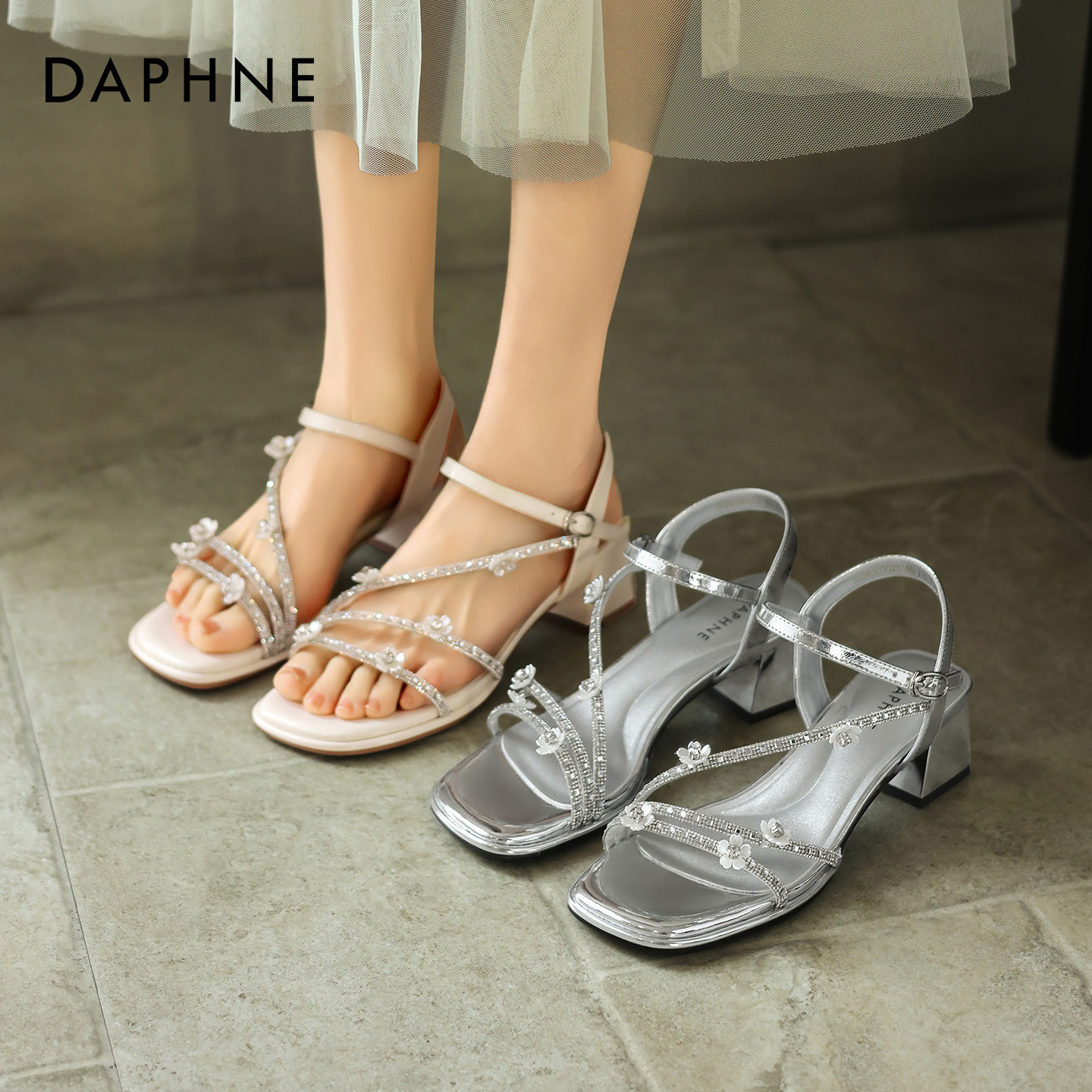 达芙妮银色水钻凉鞋女2026新款夏季仙女风配裙子粗跟一字带高跟鞋