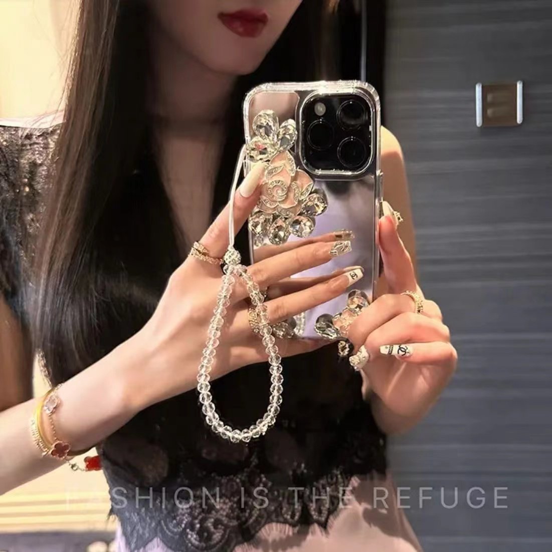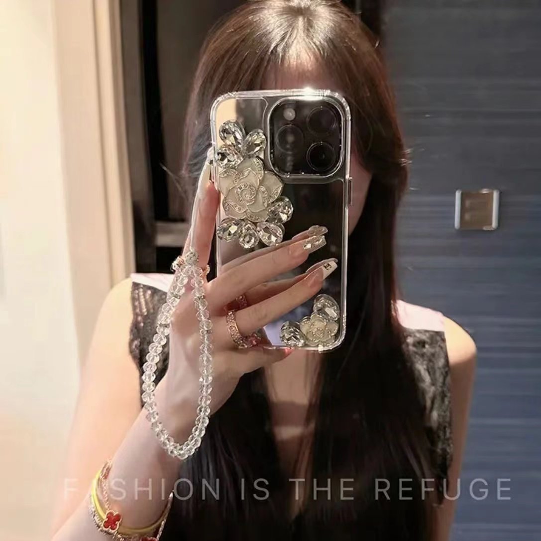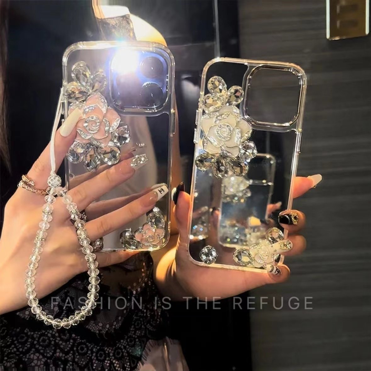 化妆镜立体水钻玫瑰花适用苹果15PROMAN手机壳高级苹果15/14/13玫瑰花奢华创意时尚简约苹果13PROMAX手机壳