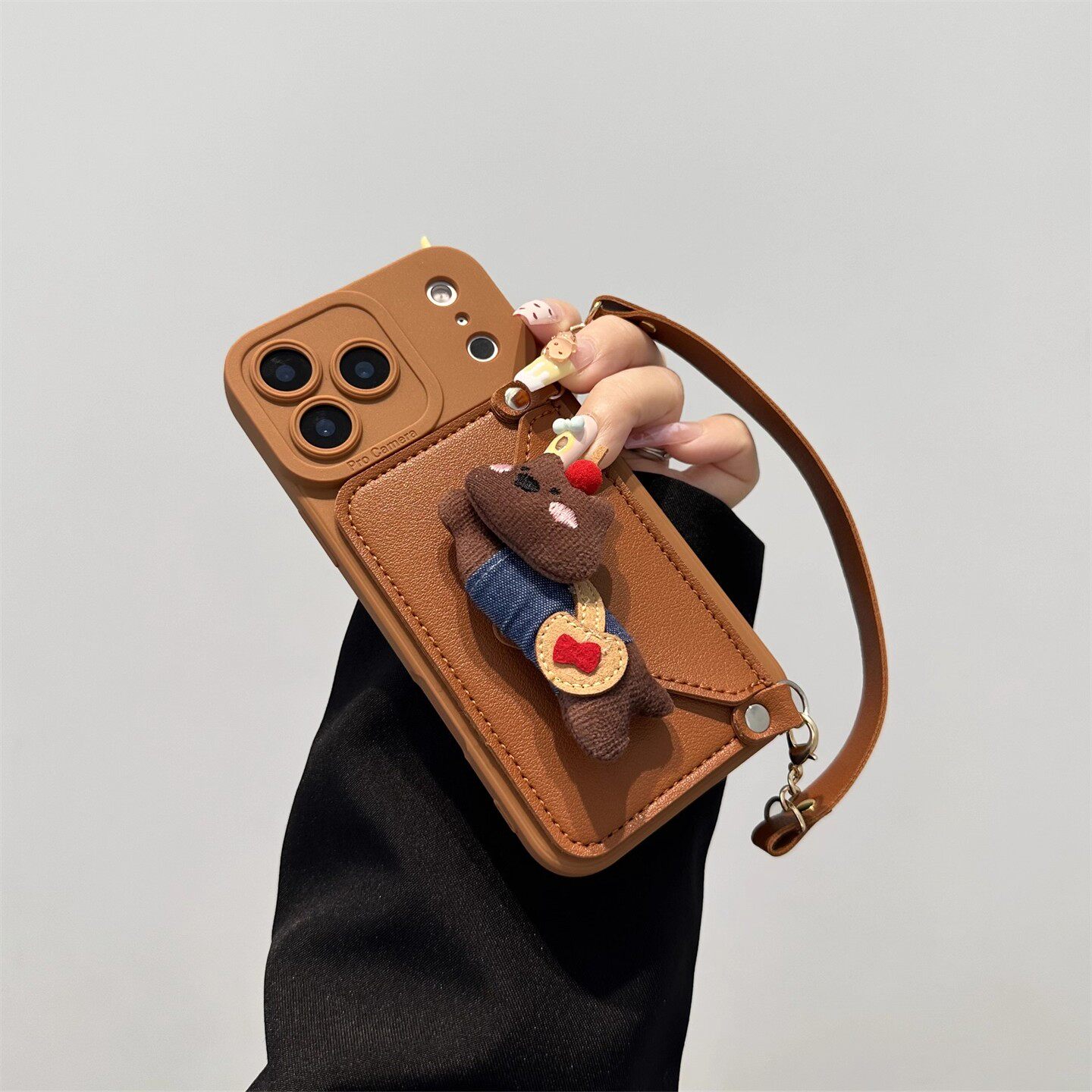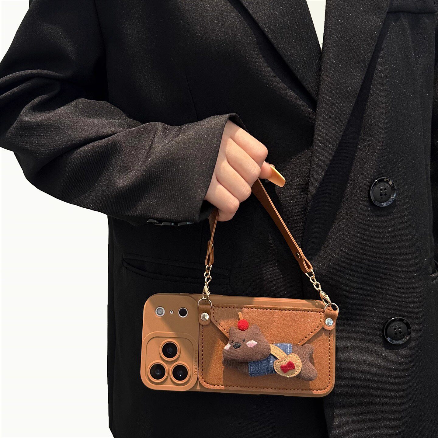 棕色樱桃小熊零钱卡包适用苹果16promax手机壳iPhone17pro背带斜挎15plus挂绳13/14全包12软硅胶8p防摔套XR女