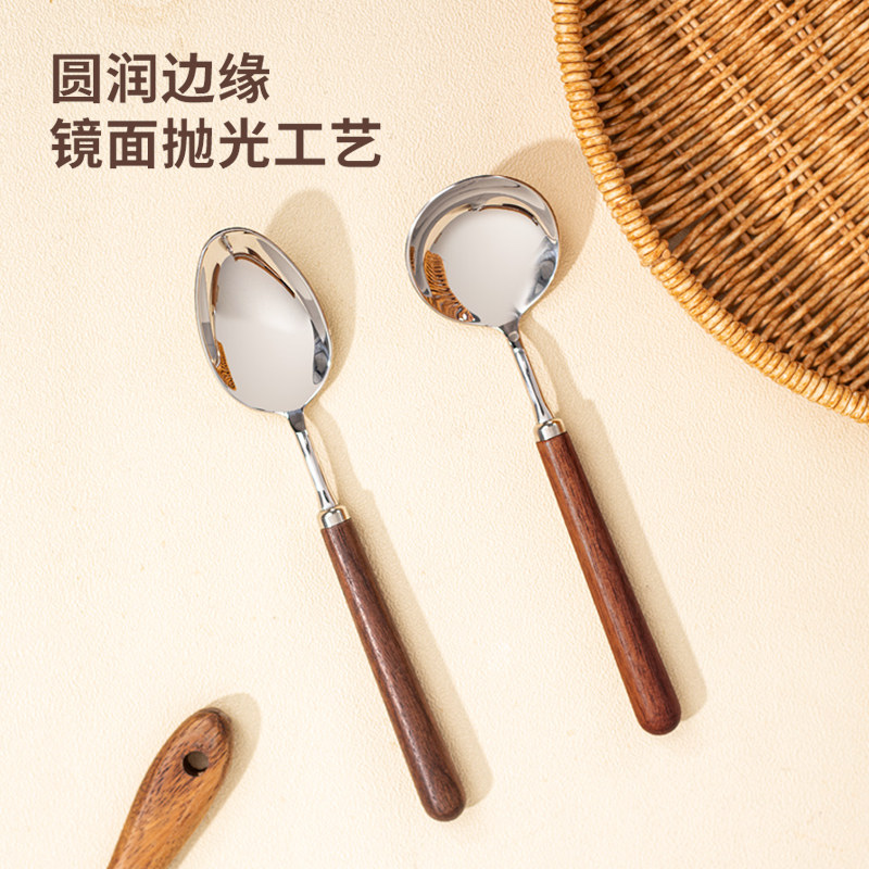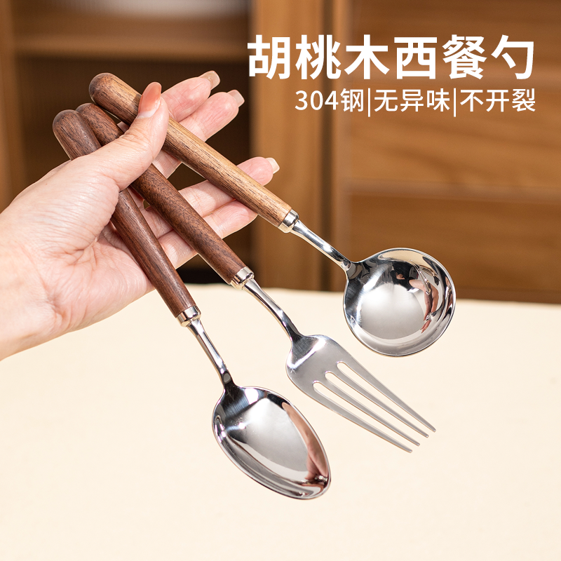 胡桃木叉勺家用304不锈钢木柄勺子叉子餐具勺食用不锈钢汤勺