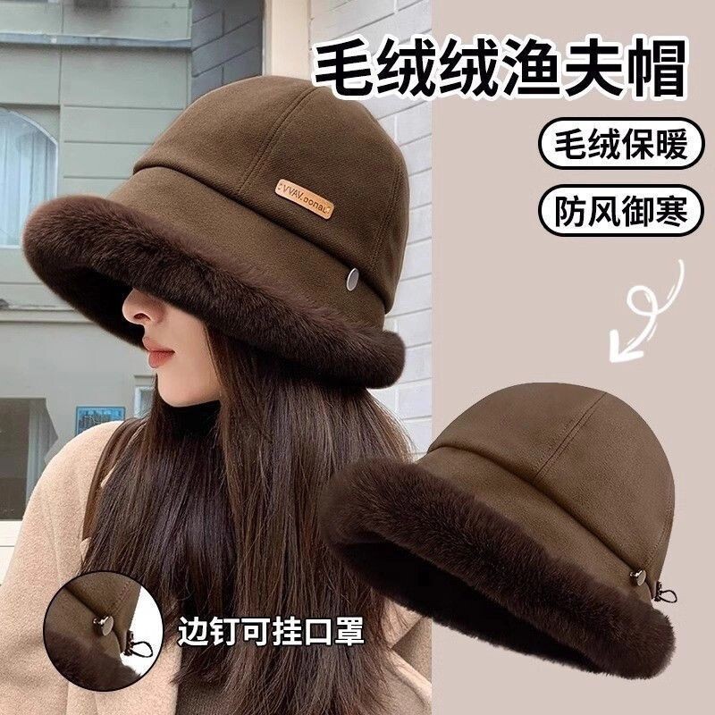 冬季新款毛绒帽子女加绒渔夫帽冬天加厚保暖棉帽东北盆帽防风黑色