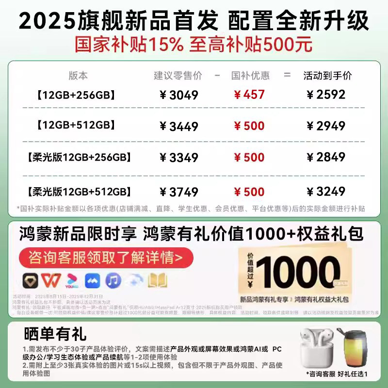 【政府补贴】华为平板电脑2025新款MatePad Air12英寸144Hz高刷屏2.8K高清办公学习学生看剧绘画官方旗舰正品