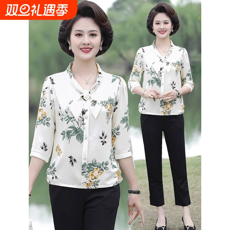 2025新款天丝棉麻套装中老年人女装夏季短袖衬衫妈妈夏装薄款外套