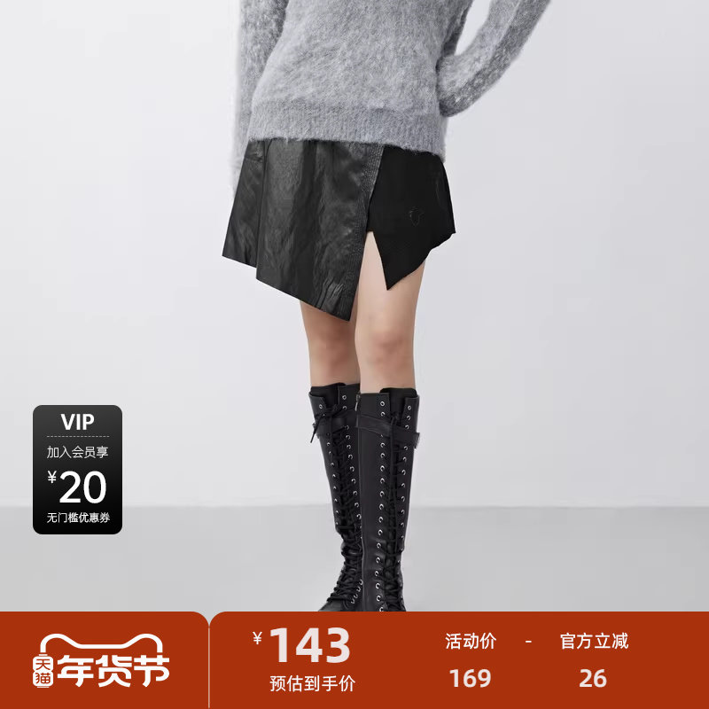 sdeer圣迪奥女装冬裙子个性拼接不规则毛呢A字黑色短裙S21481307
