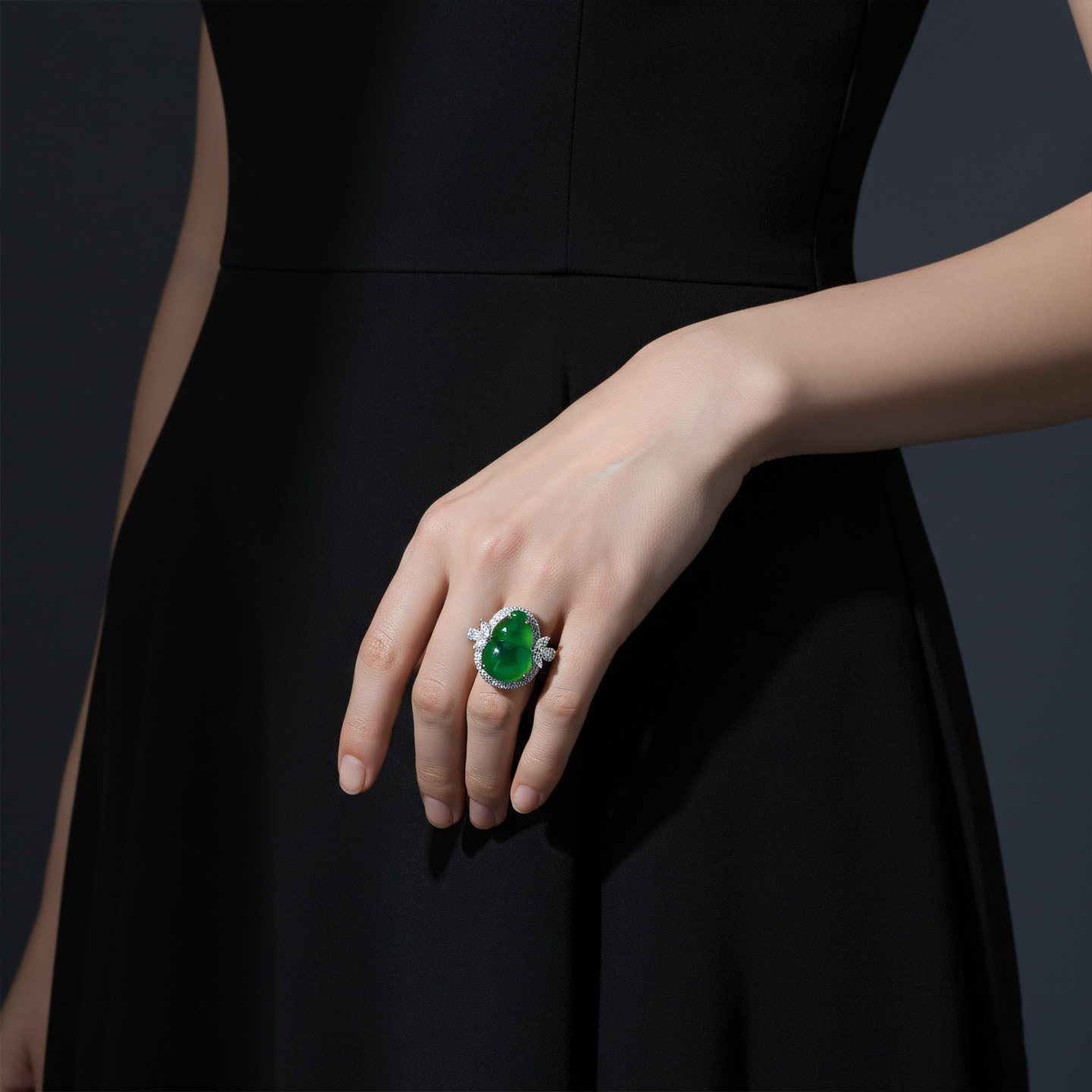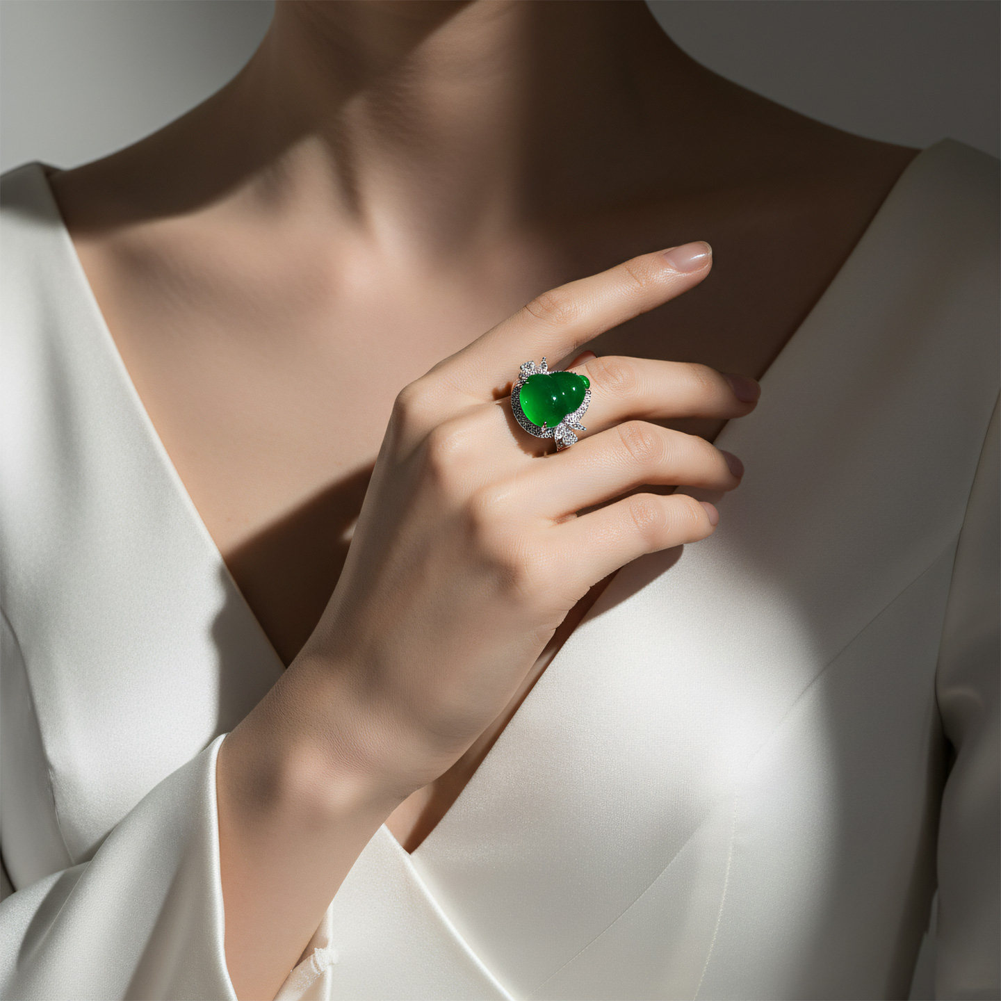 AILEQ925银镶嵌天然玉髓满绿葫芦福禄春夏戒指直播爆款媲美翡翠K5