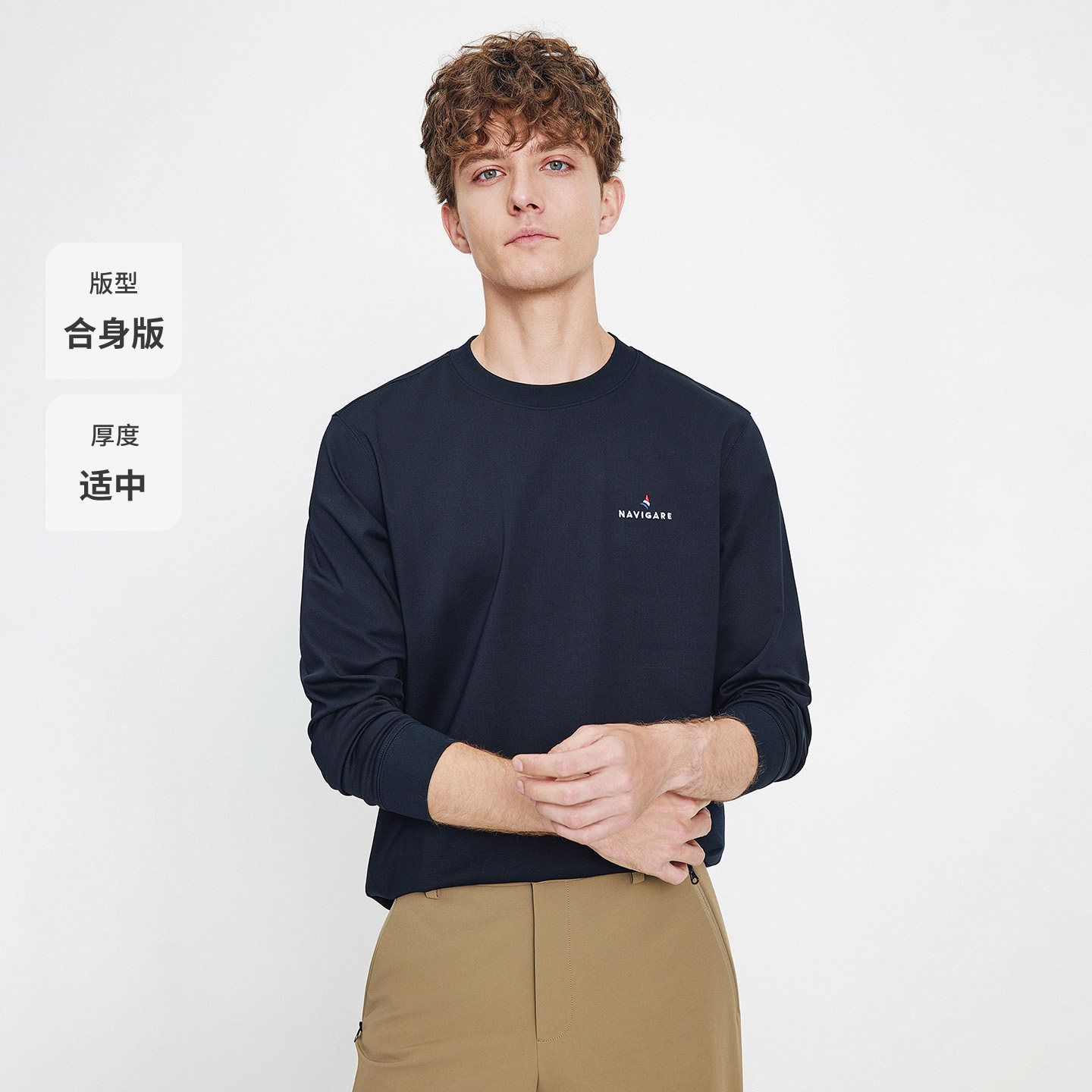 Navigare意大利小帆船圆领套头长袖T恤男士春秋季新款休闲体恤衫