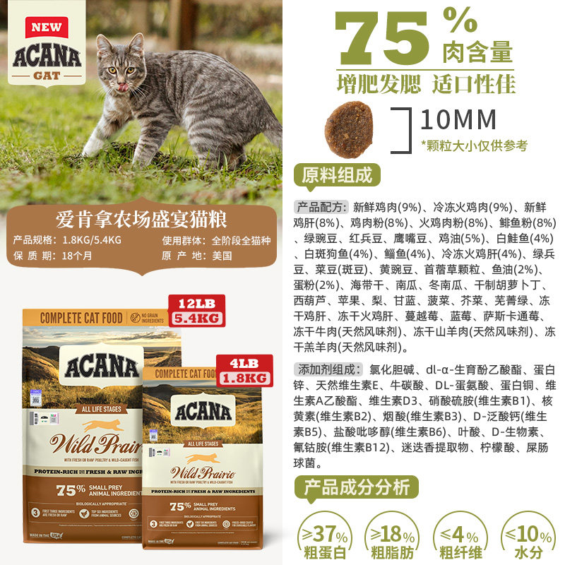 ACANA爱肯拿农场盛宴猫粮鸡肉味增肥发腮进口全价幼猫粮5.4kg