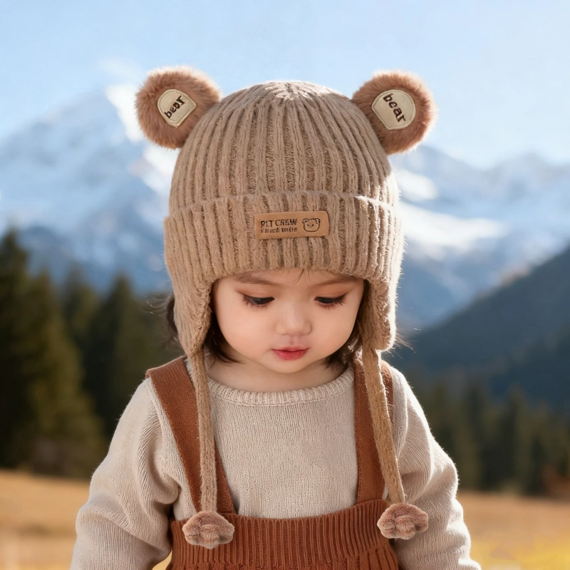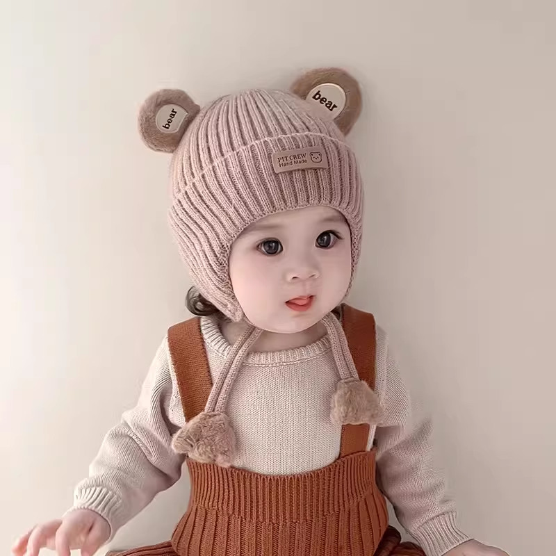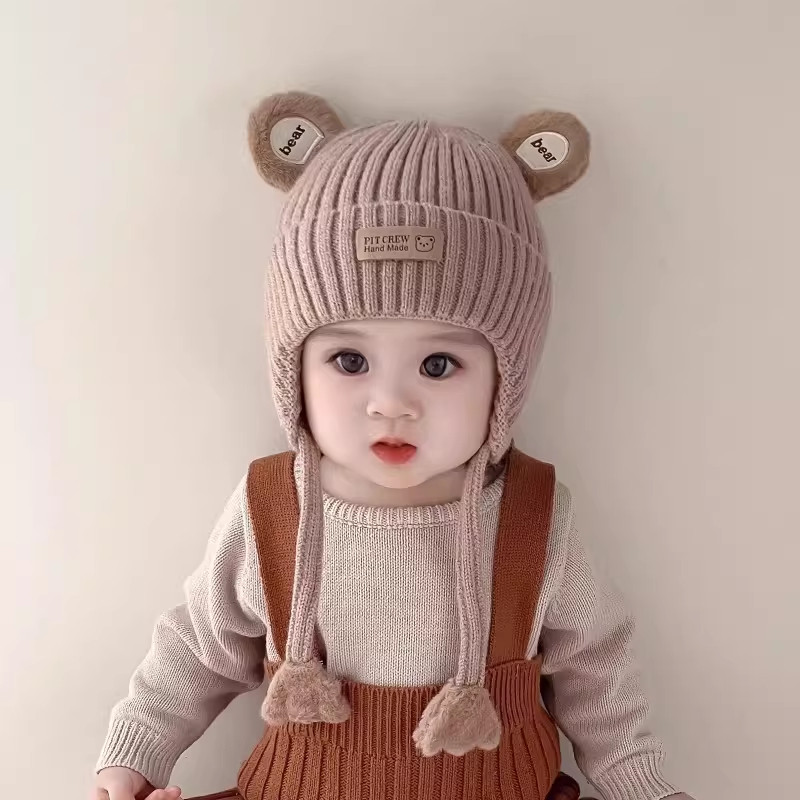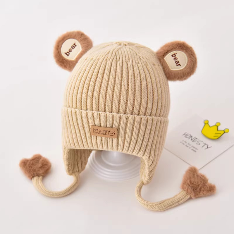 hugz儿童帽子男孩女孩保暖针织毛线帽秋冬季户外护耳防风熊仔帽子