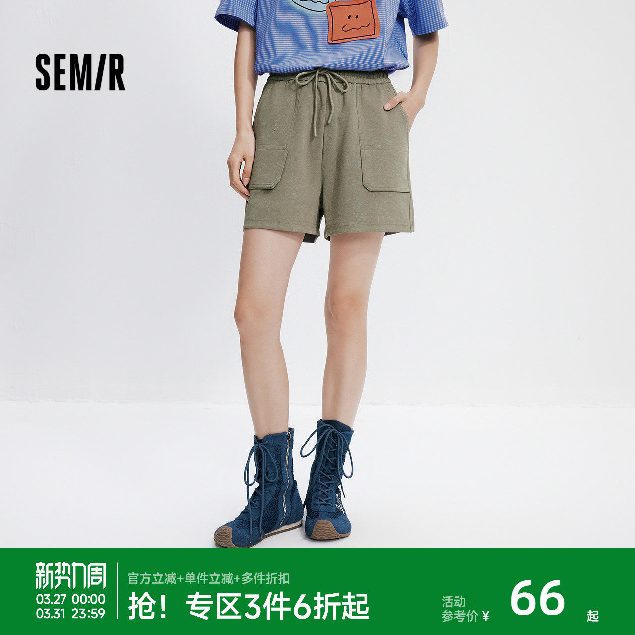 森马休闲裤女夏季松紧腰宽松针织直筒裤女士运动风简约ins潮短裤