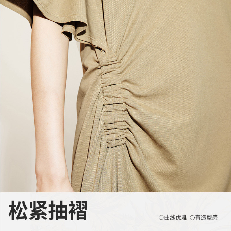 LESS夏季裙子女气质法式松紧抽褶不规则下摆短袖连衣裙2N4G12180