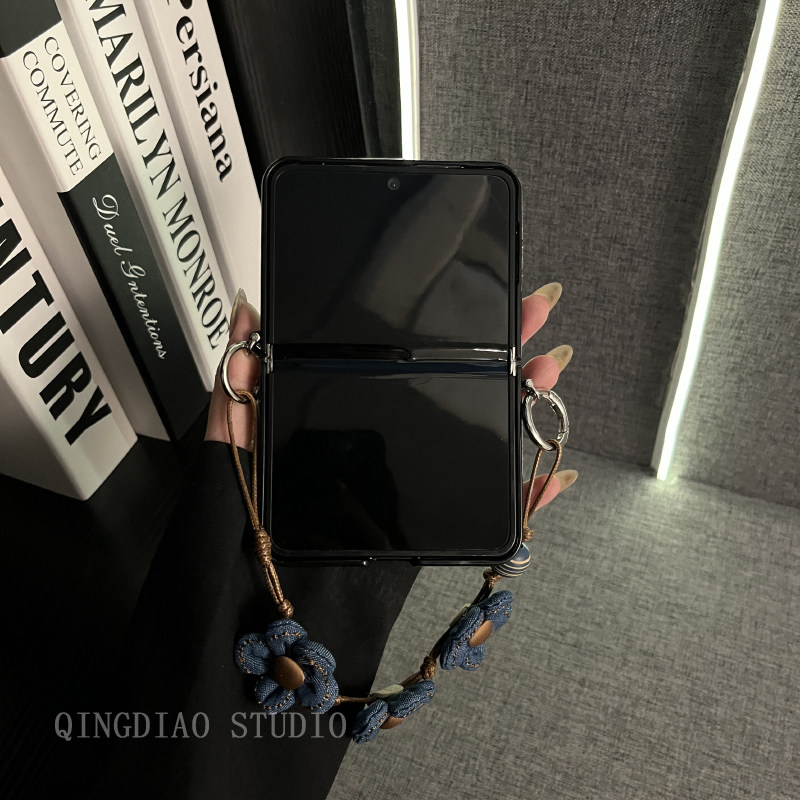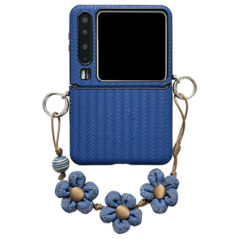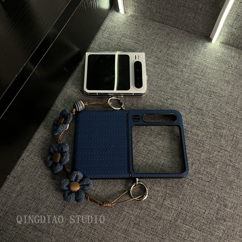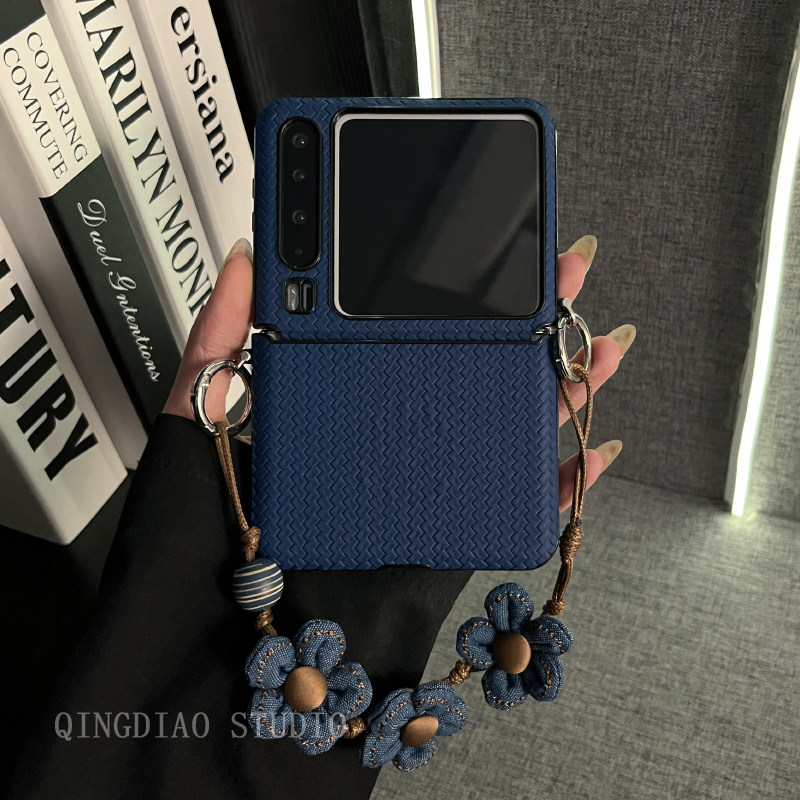 轻调 ins唯美深蓝草席纹花朵手提链适用于华为Pura X手机壳全包新款purax典藏版折叠屏p50宝盒翻盖防摔保护套