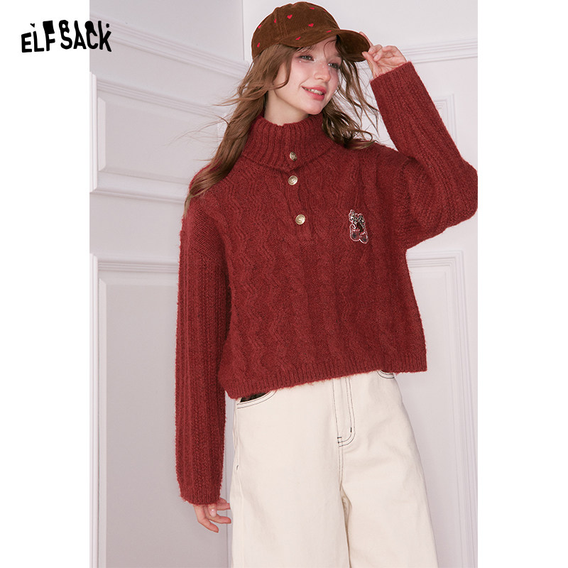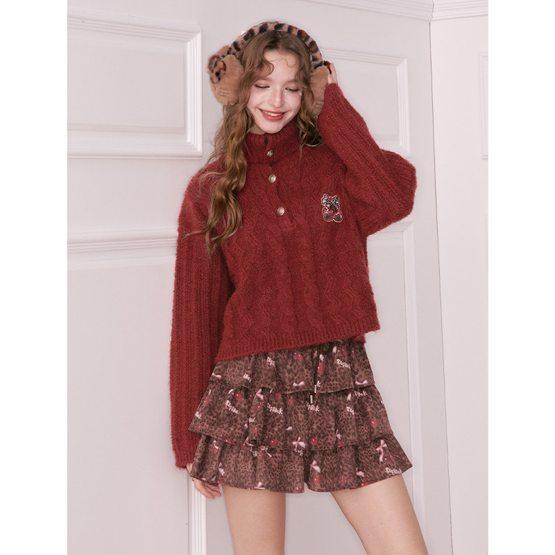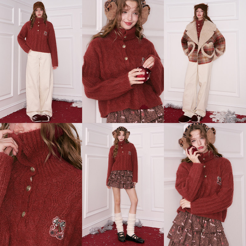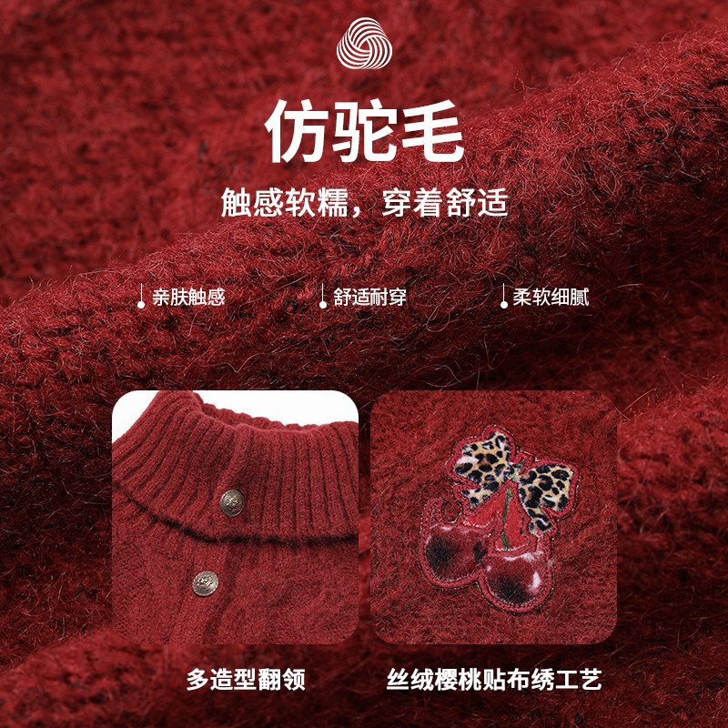 妖精的口袋复古绞花红色高领厚毛衣女2025年冬季新款樱桃新年穿搭