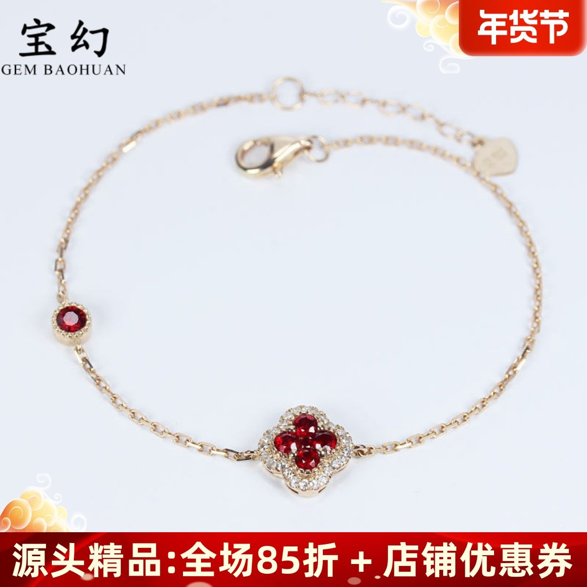 G18K玫瑰金天然鸽血红宝石四叶草手链 黄金钻石可调节时尚女款