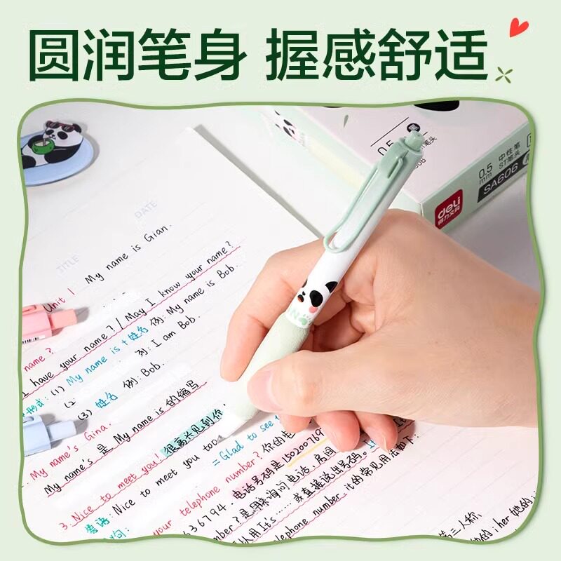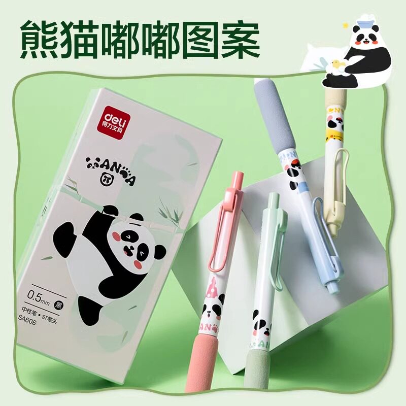 得力熊猫胖达按动中性笔ins风高颜值软握刷题笔速干顺滑ST头大容量学生考试专用碳素黑笔超可爱0.5mm签字笔