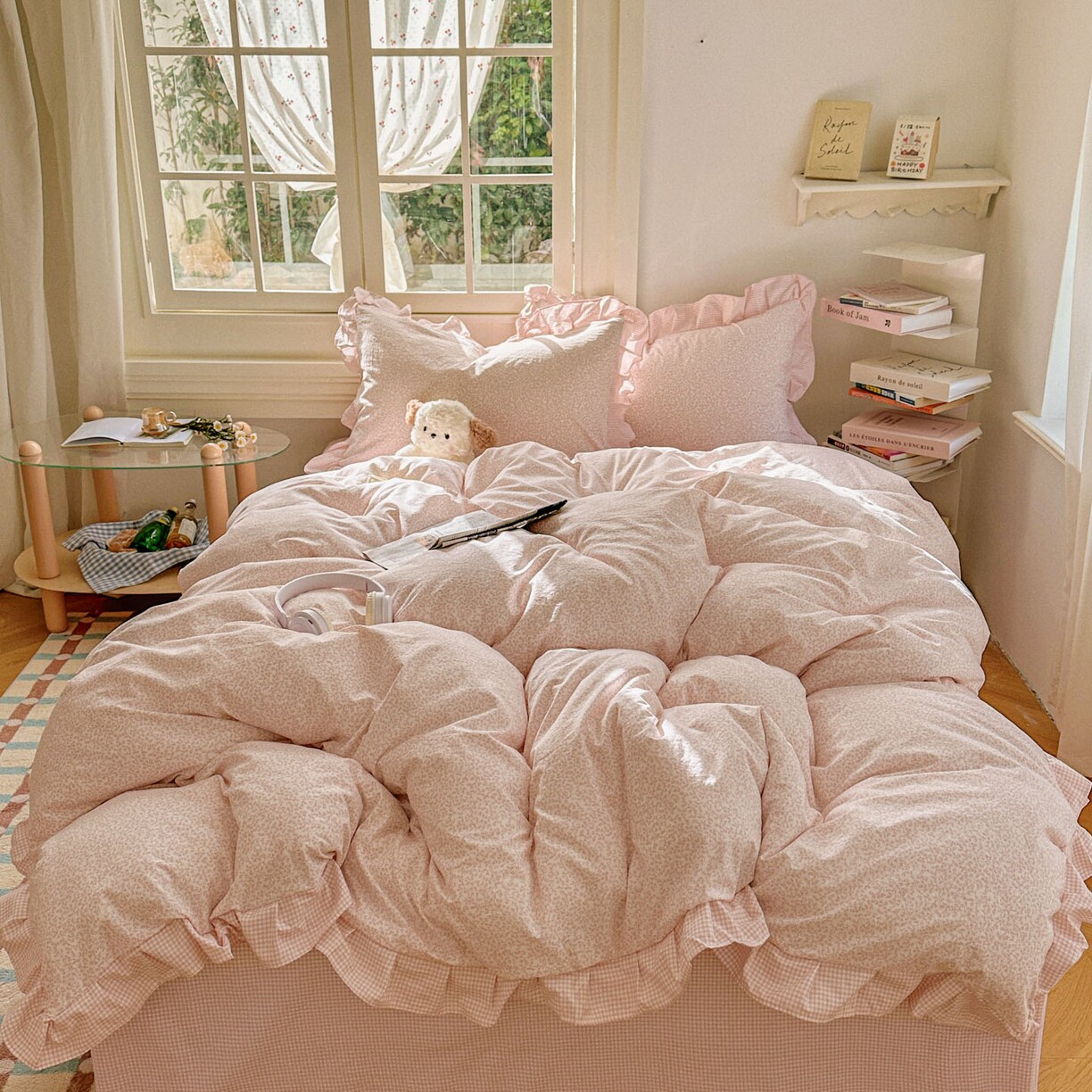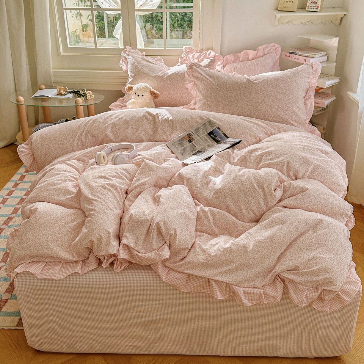 A类韩版花边小碎花古法水洗仿棉砂洗云小棉四件套荷叶边床单被套