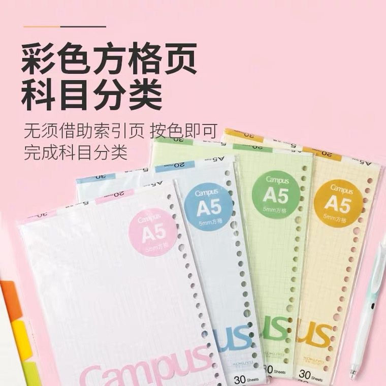 kokuyo日本国誉campus彩色活页替换芯5mm方格进口纸张活页本B5/A5