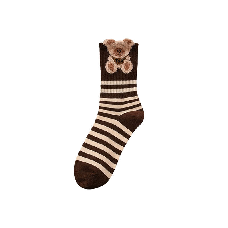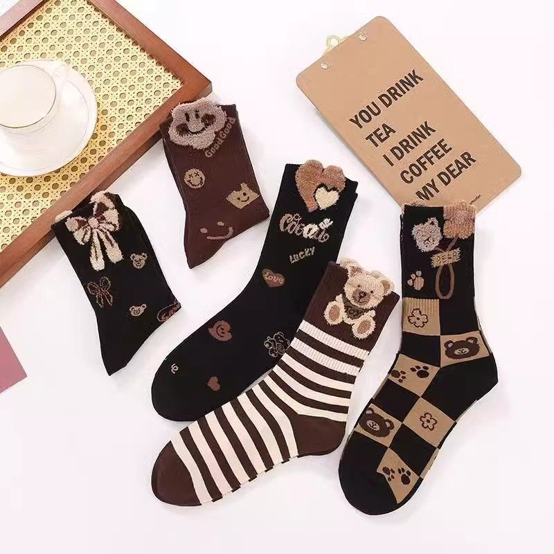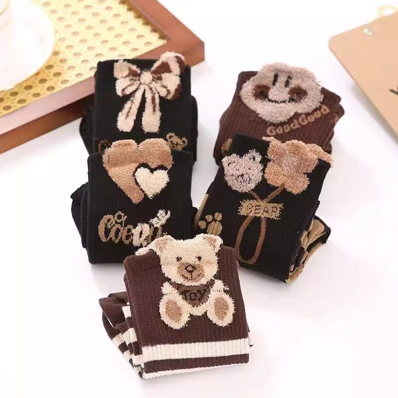 植绒可爱小熊秋冬袜子女款2025新款爆款中筒袜保暖美拉德月子长袜
