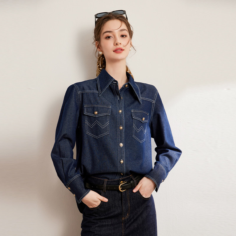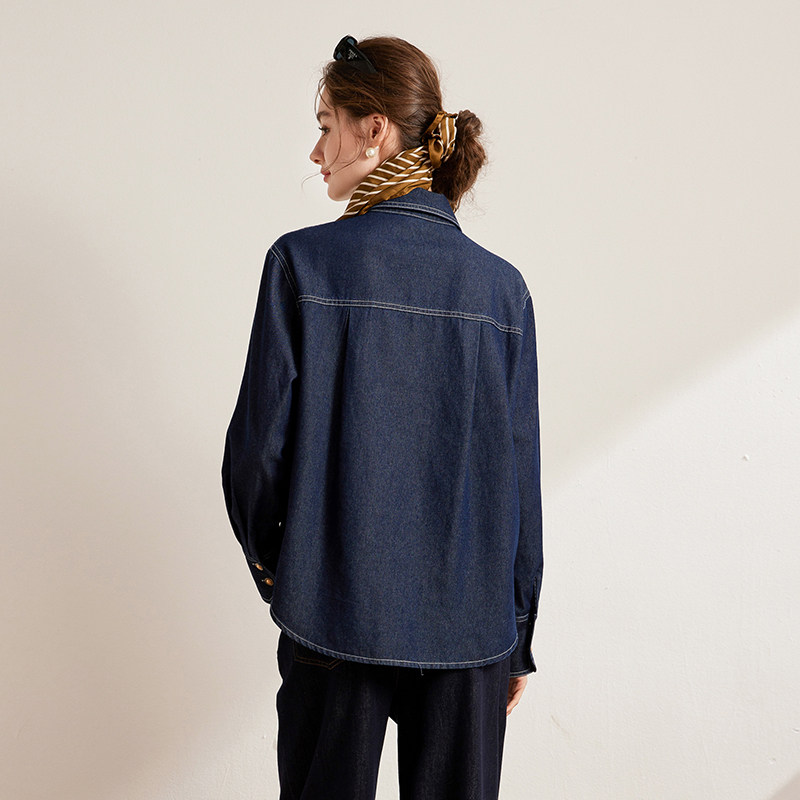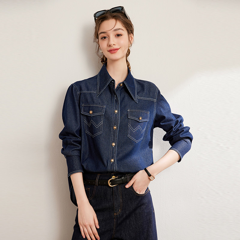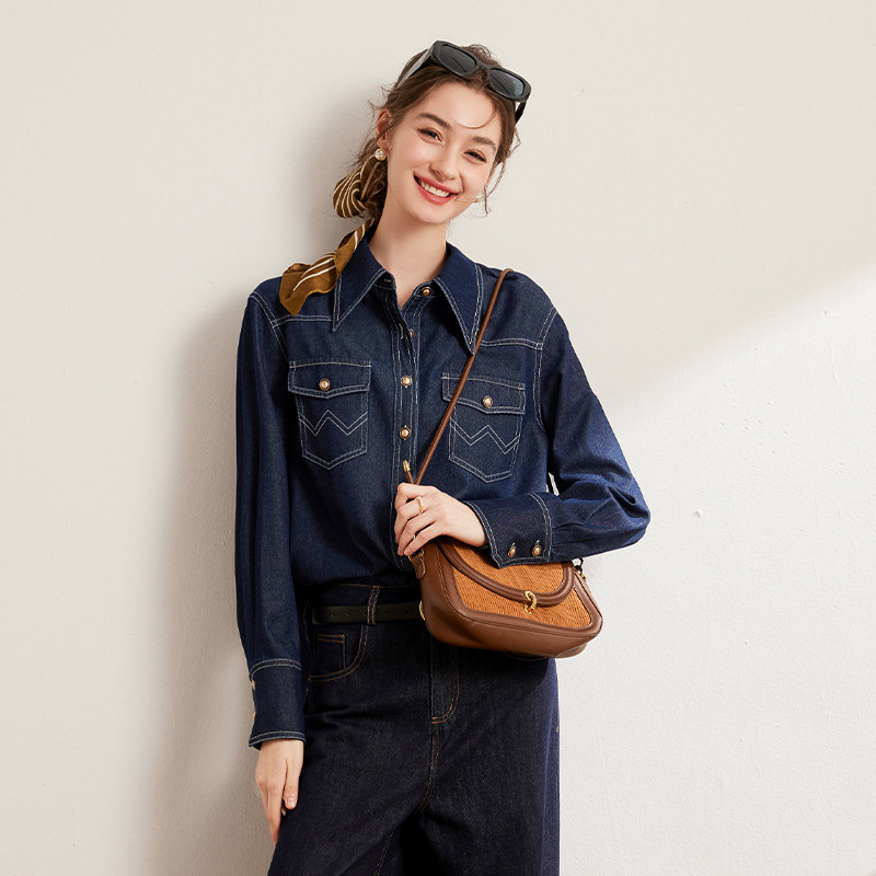 白鹿语撞色明线牛仔衬衣2025春季新款复古翻领单排扣长袖女式衬衫