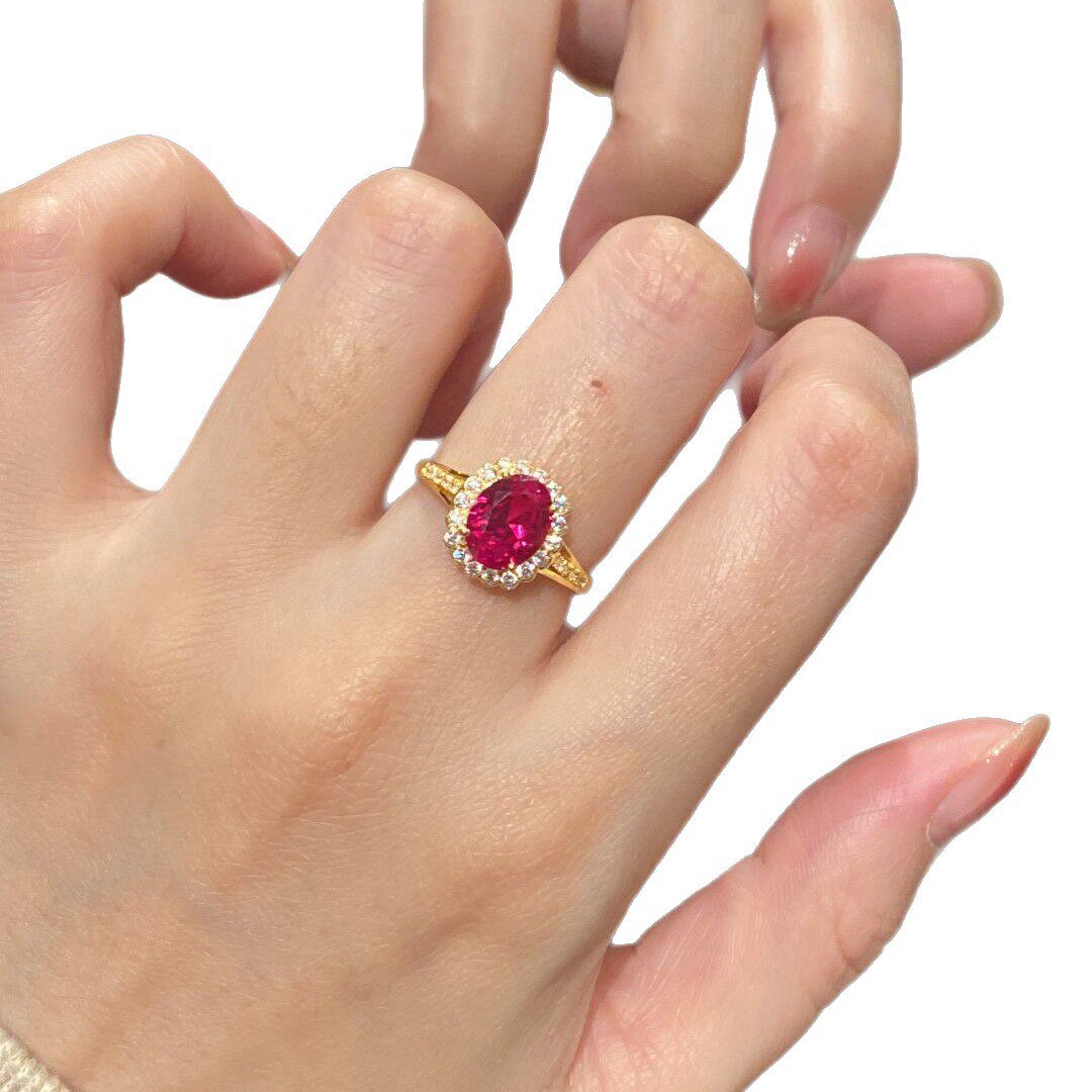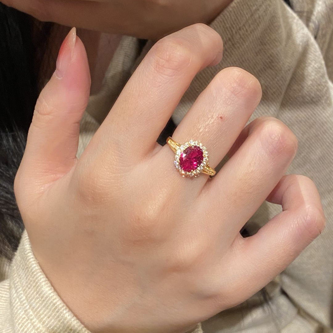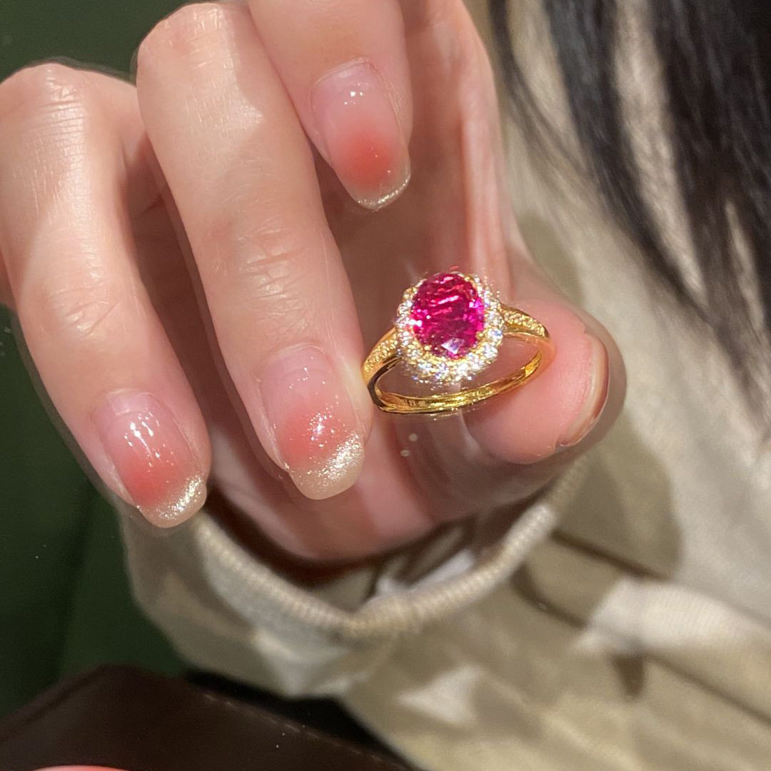 中古风鸽子蛋玫红锆石戒指女小众镶钻金色指环时尚轻奢高级感手饰