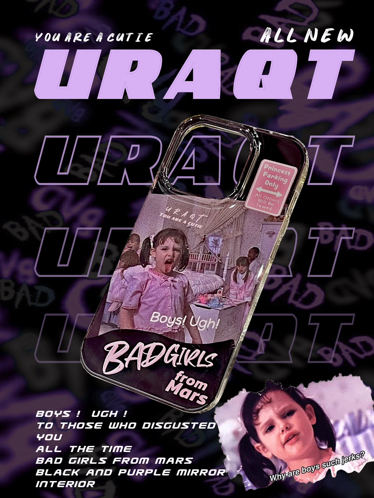 URAQT原创【男生走开】暴躁洋娃娃y2k小众适用苹果iPhone16promax紫黑镜面双层15手机壳