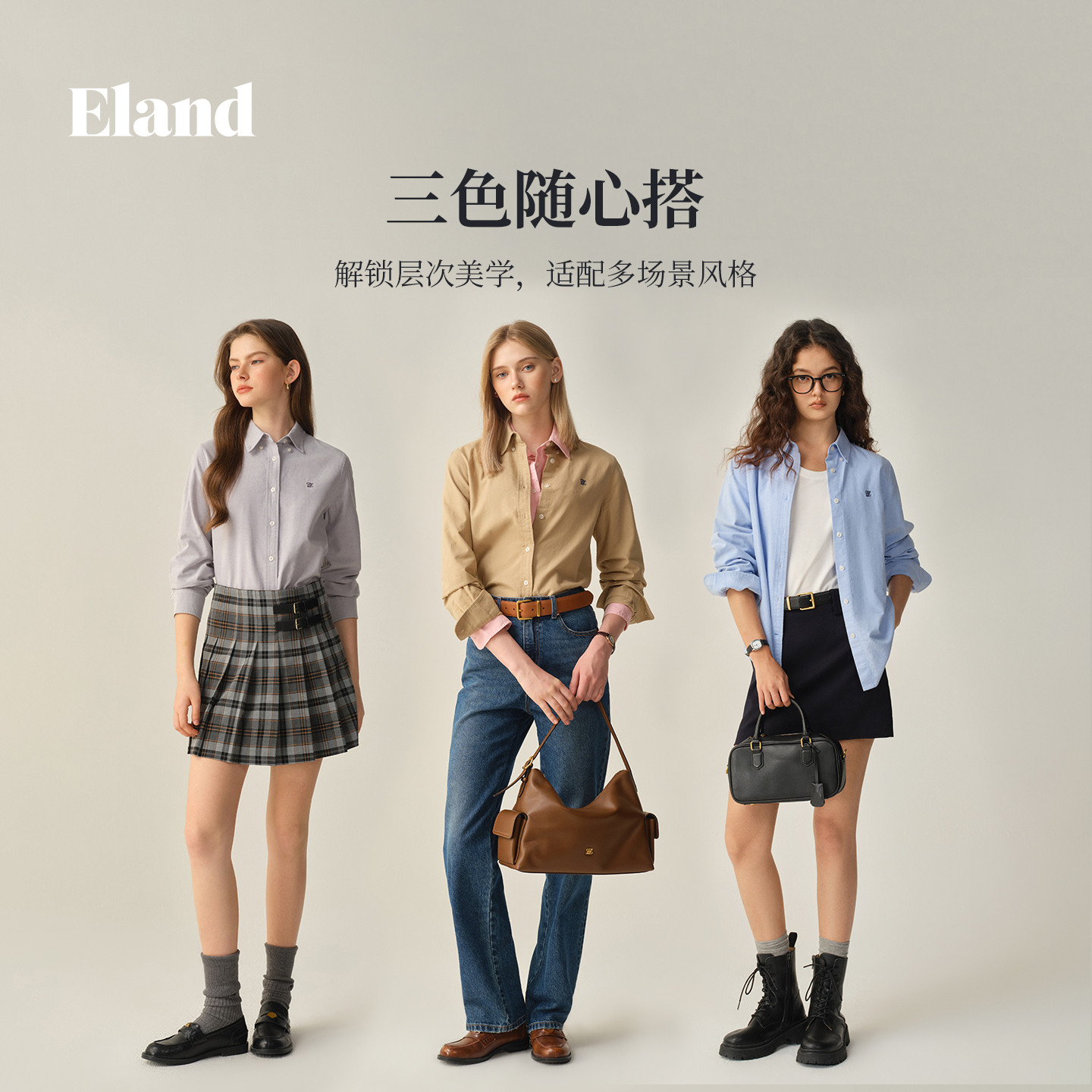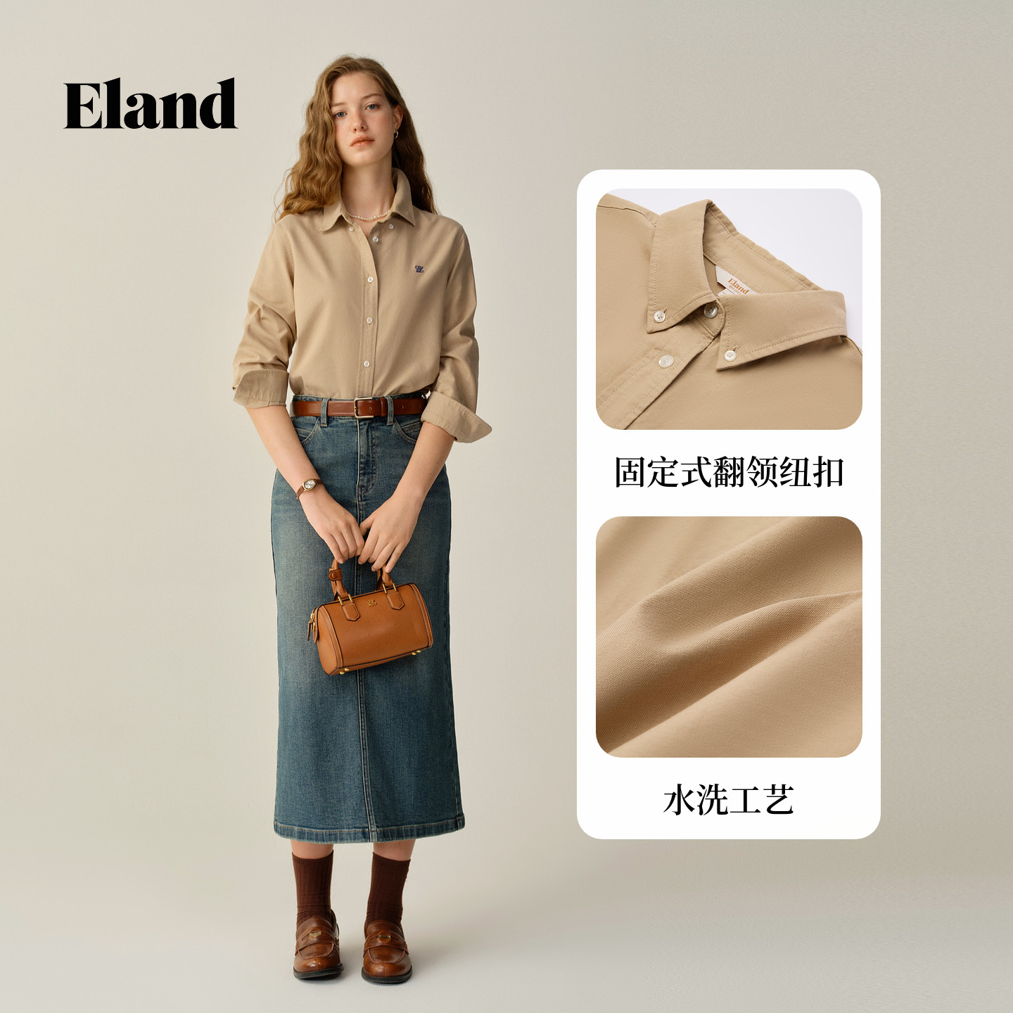 【100%棉】Eland衣恋衬衫女纯色长袖翻领上衣2025冬季新款