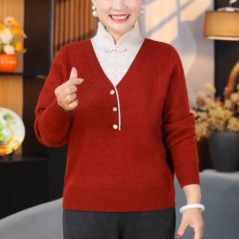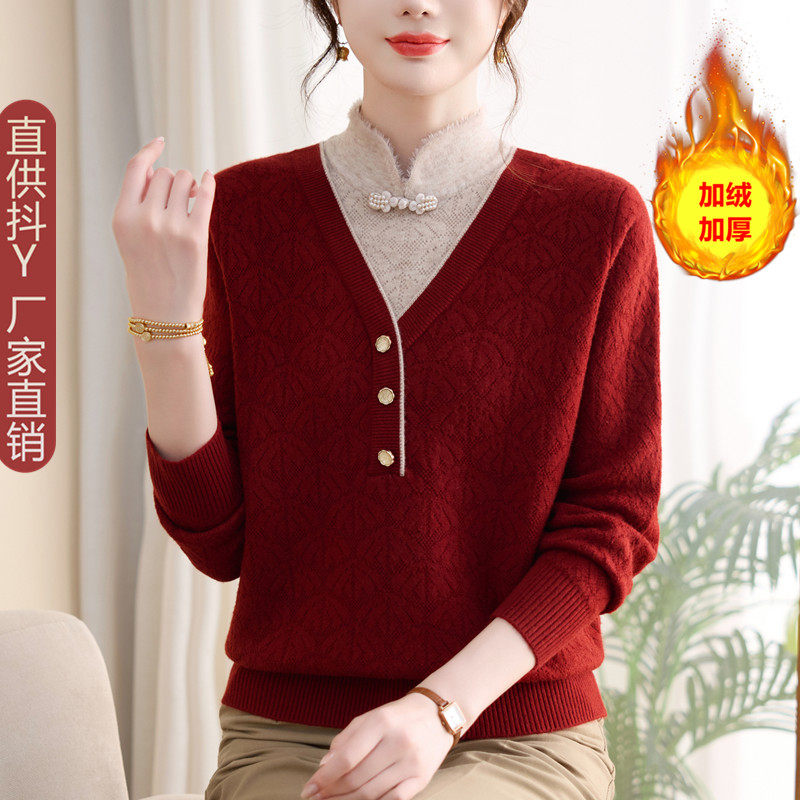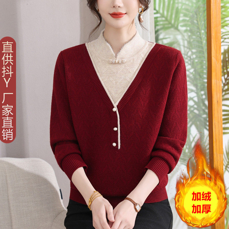 2025新款假两件针织衫妈妈装秋冬加绒加厚毛衣中老年女装保暖上衣