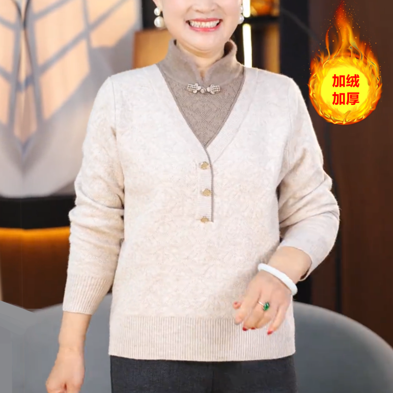 2025新款假两件针织衫中老年人女装加绒加厚毛衣妈妈冬装保暖内搭