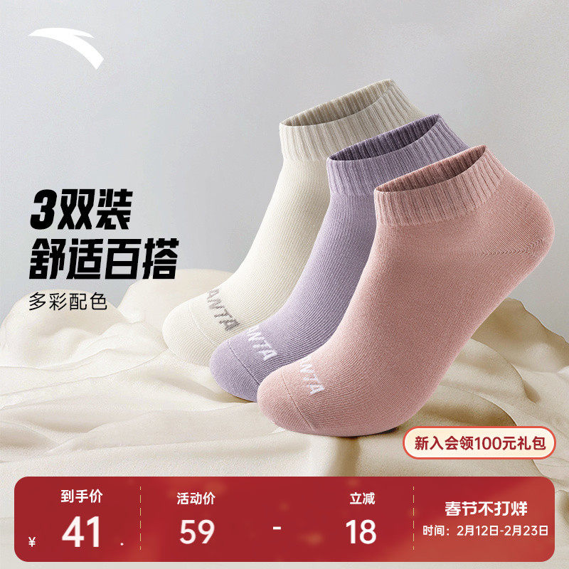 安踏运动袜3双装纯色女袜船袜跑步训练健身纯棉吸汗短袜短筒袜子