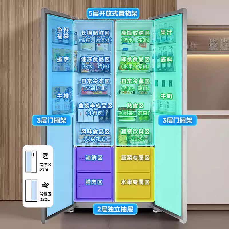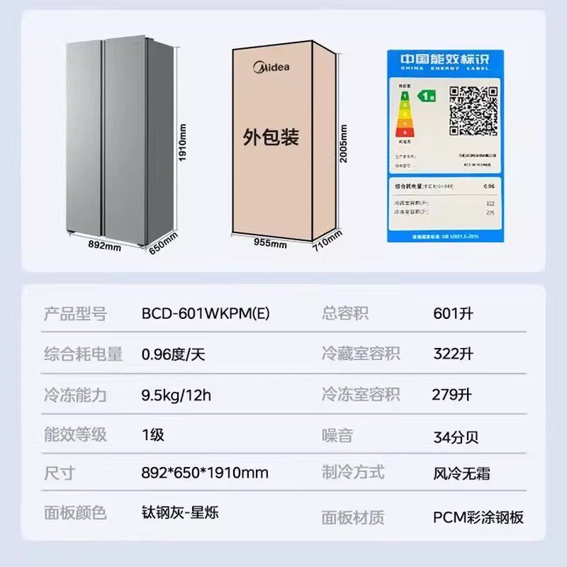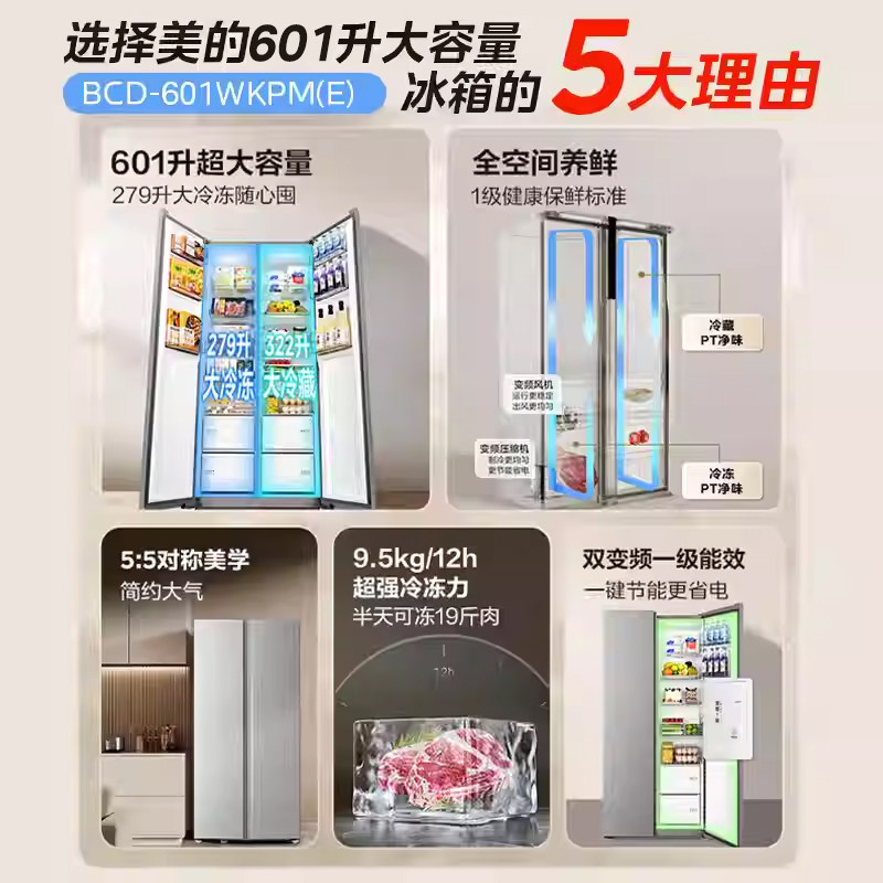 美的601双变频大容量对开门家用电冰箱风冷无霜节能省电净味抗菌