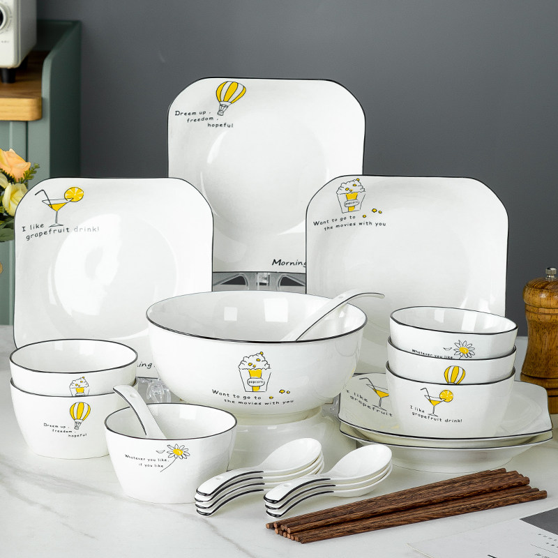创意卡通可爱萌宠恐龙饭碗餐盘组合套装家用高颜值陶瓷方形碗菜盘