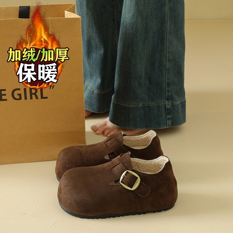 羊皮版复古玛丽珍鞋女方头秋冬季加绒保暖毛毛棉鞋平底晚晚单鞋女