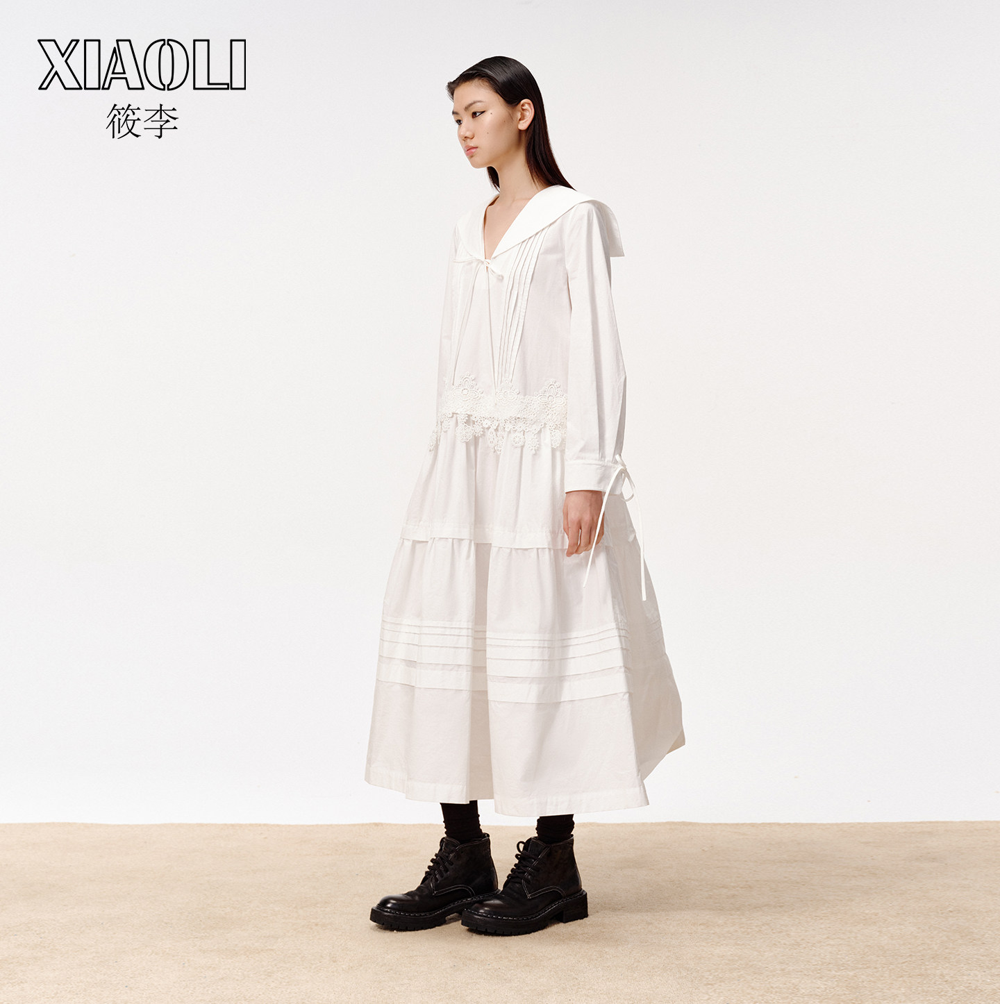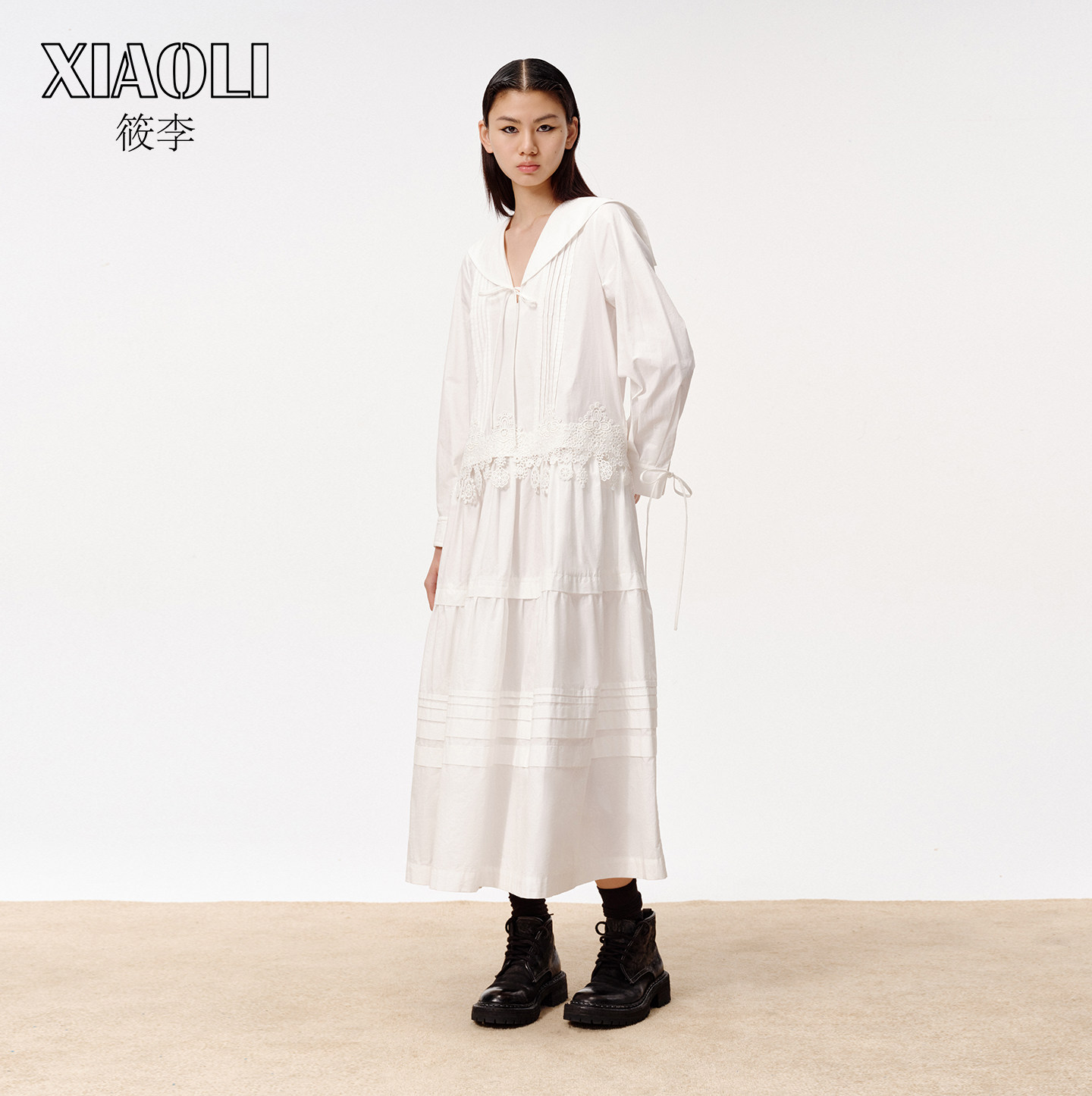 【XIAOLI筱李】白色蕾丝装饰塔克工艺连衣裙